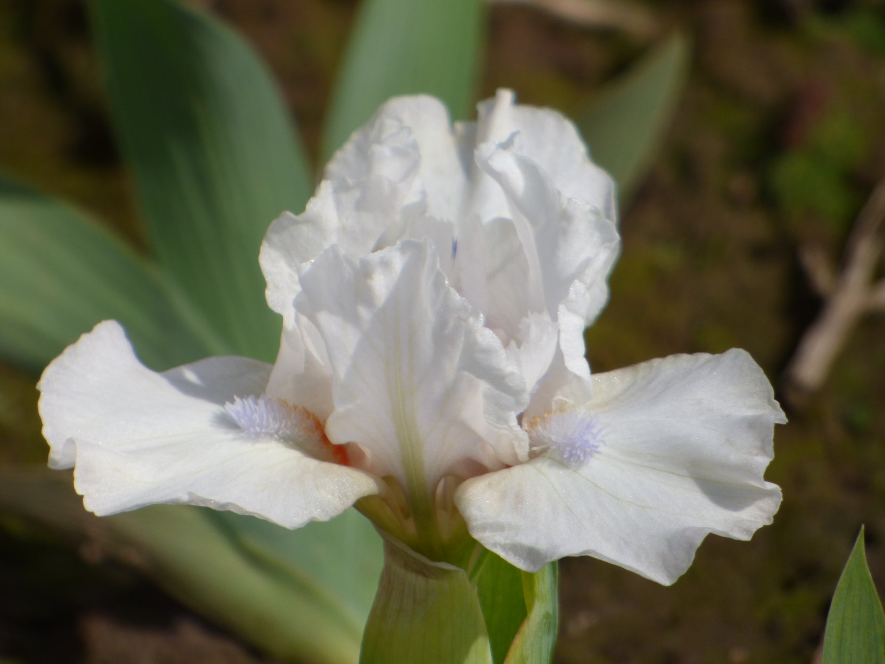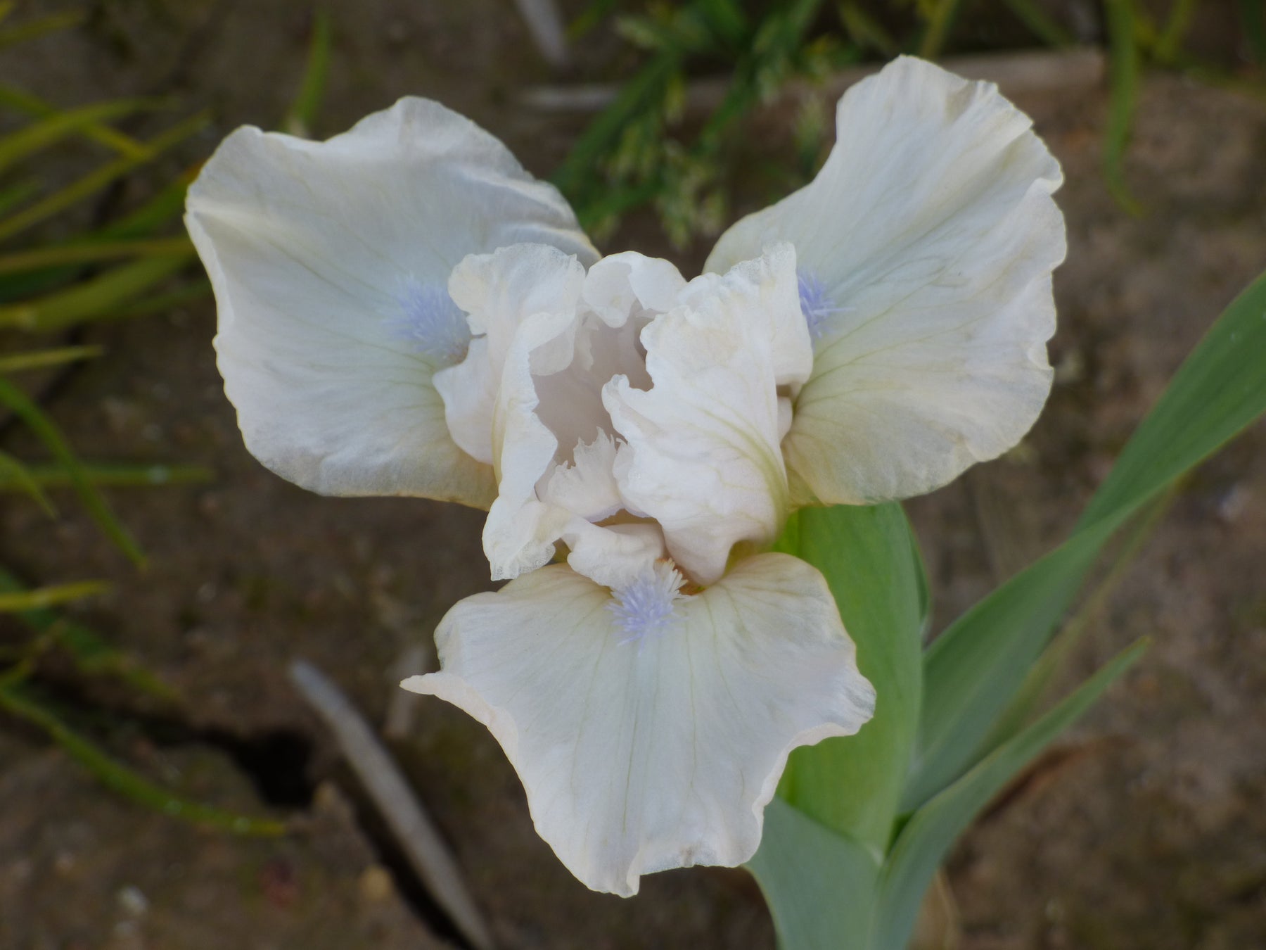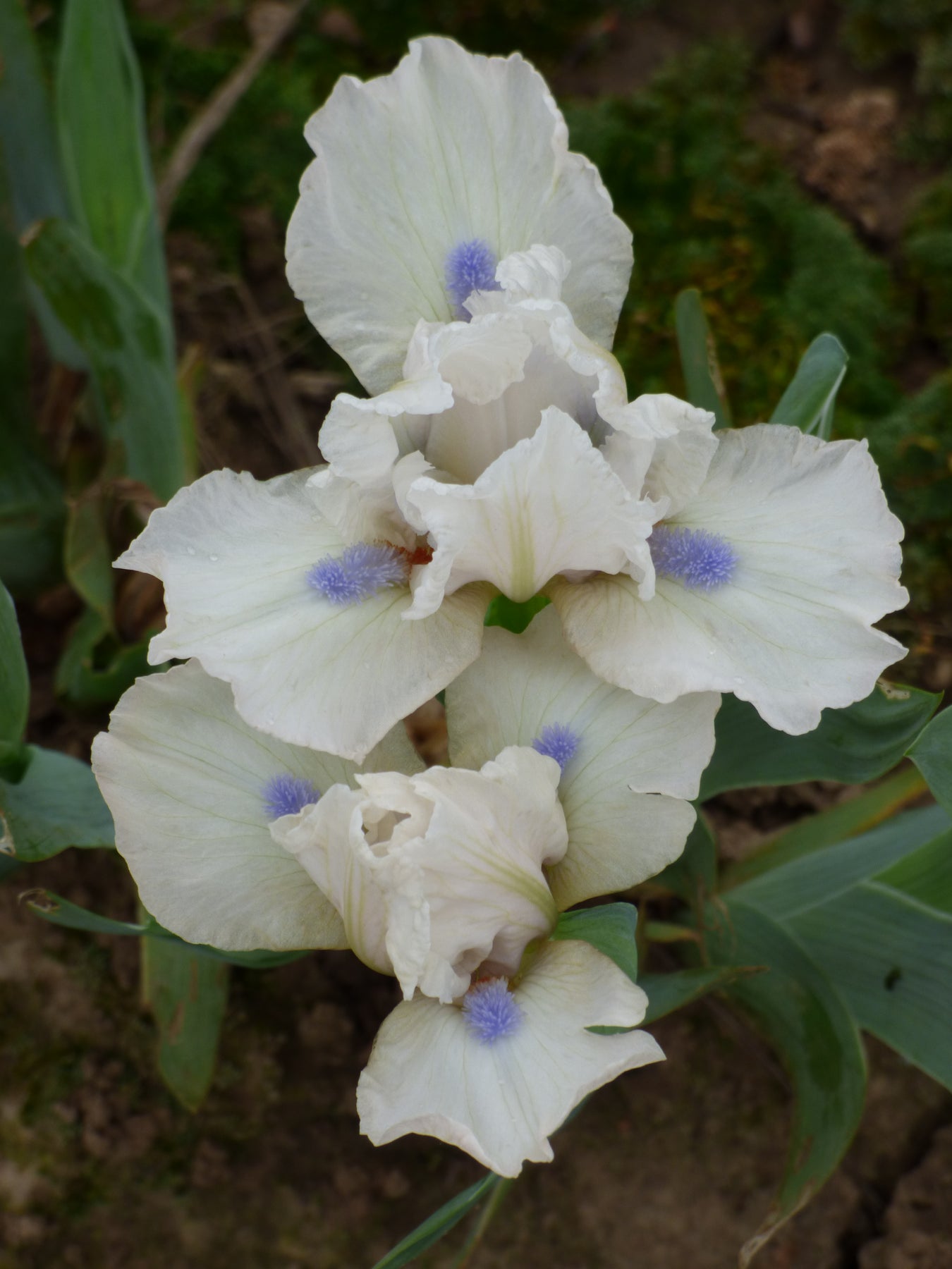 Standard Dwarf Bearded Iris: Veritas makes an elegant and pristine addition to the early spring garden. Note the cool violet-blue beards that peak coyly from their soft pastel backdrop. This late-season bloomer also carries a pronounced floral scent.