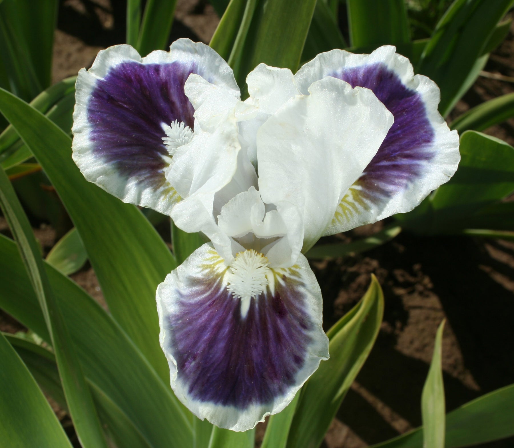 Standard Dwarf Bearded Iris: White standards, pale yellow beards, purple falls edged in 1/4 inch rim of white