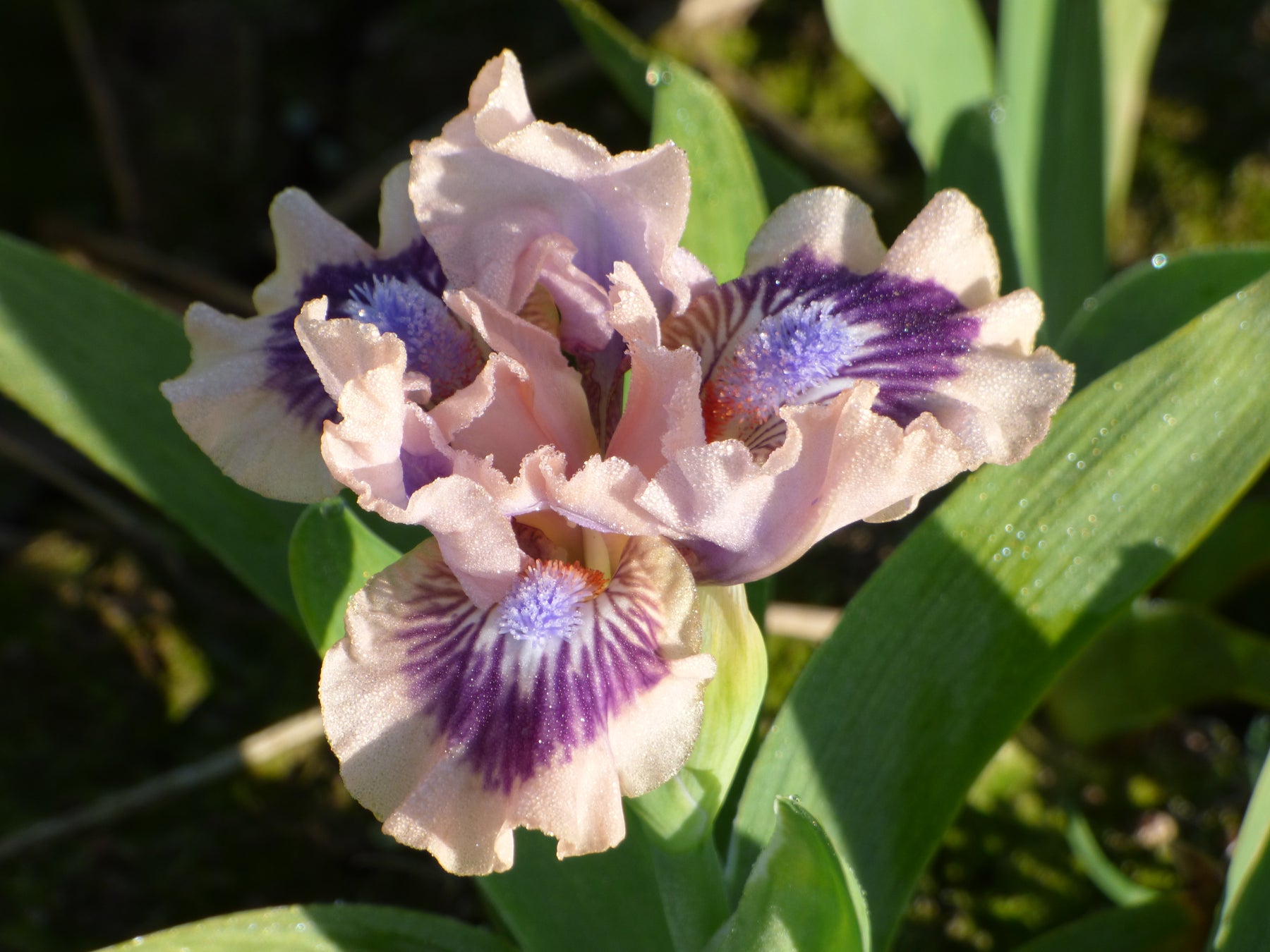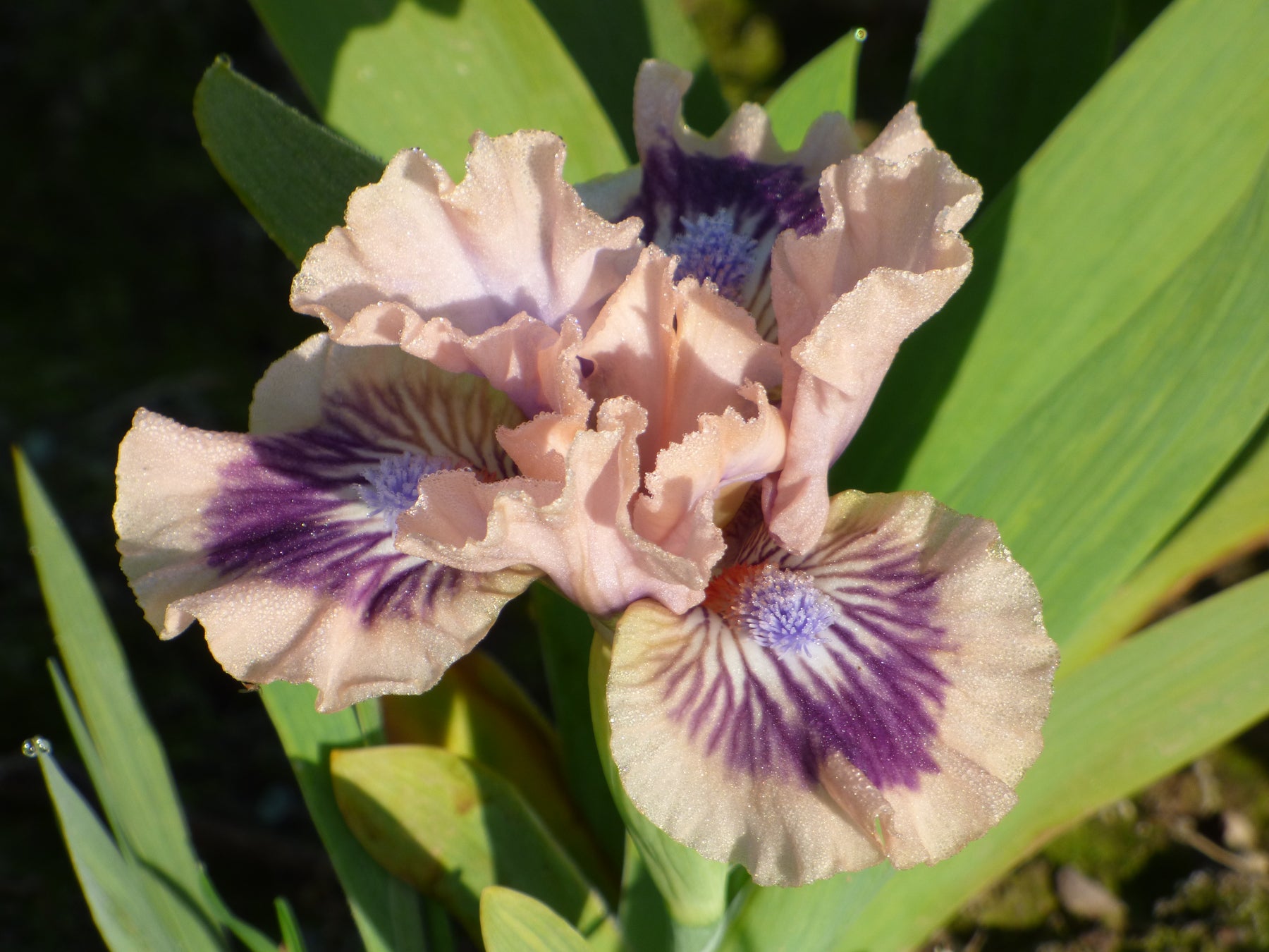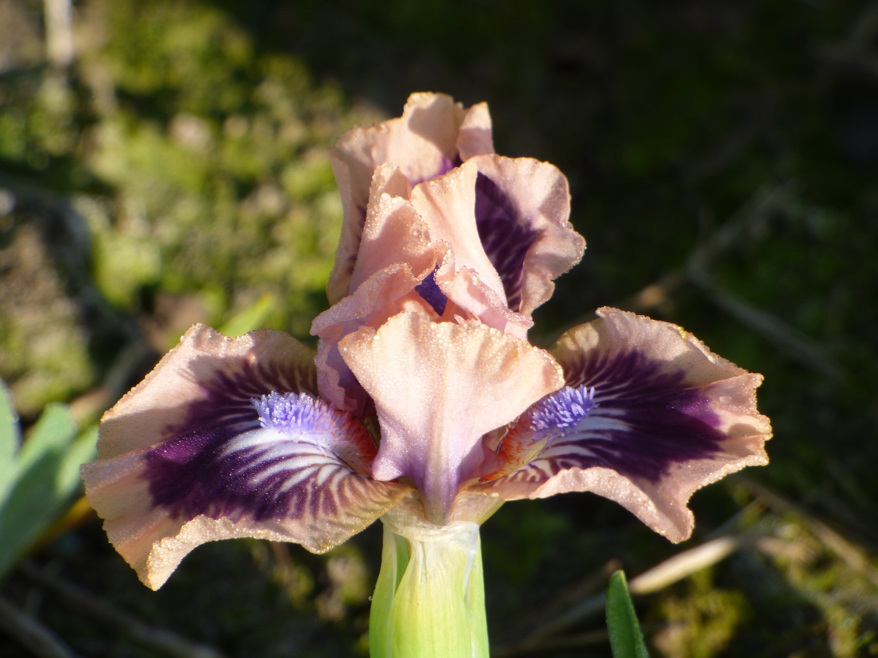 Standard Dwarf Bearded Iris: Apricot pink with burgundy spot on fall.