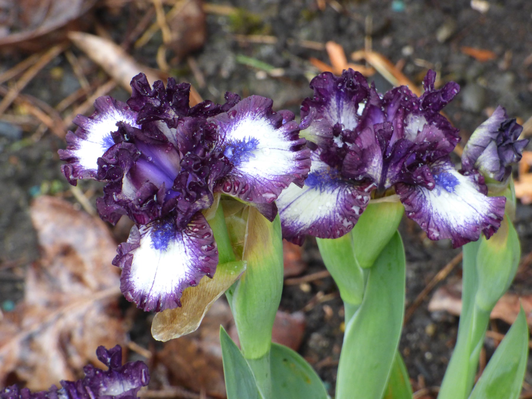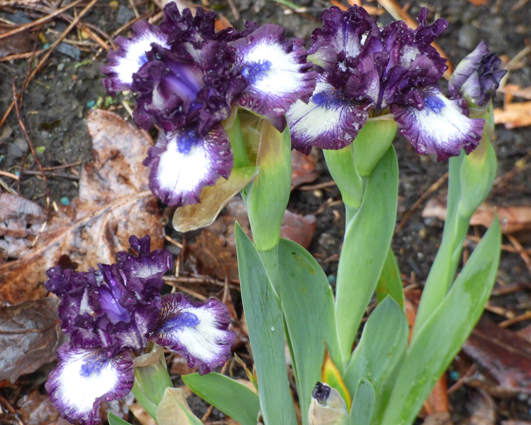 Standard Dwarf Bearded Iris: Standards even ¼˝ black edge rim, inner rim dark purple, random dots, short purple lines on warm white ground; style arms black. Falls warm white ground, even black rim at edge, dark purple inner rim, circle of short lines and dots, wire thin median line, burnt brown shoulders; beards deep blue-violet; pronounced spicy fragrance; some ruffles.