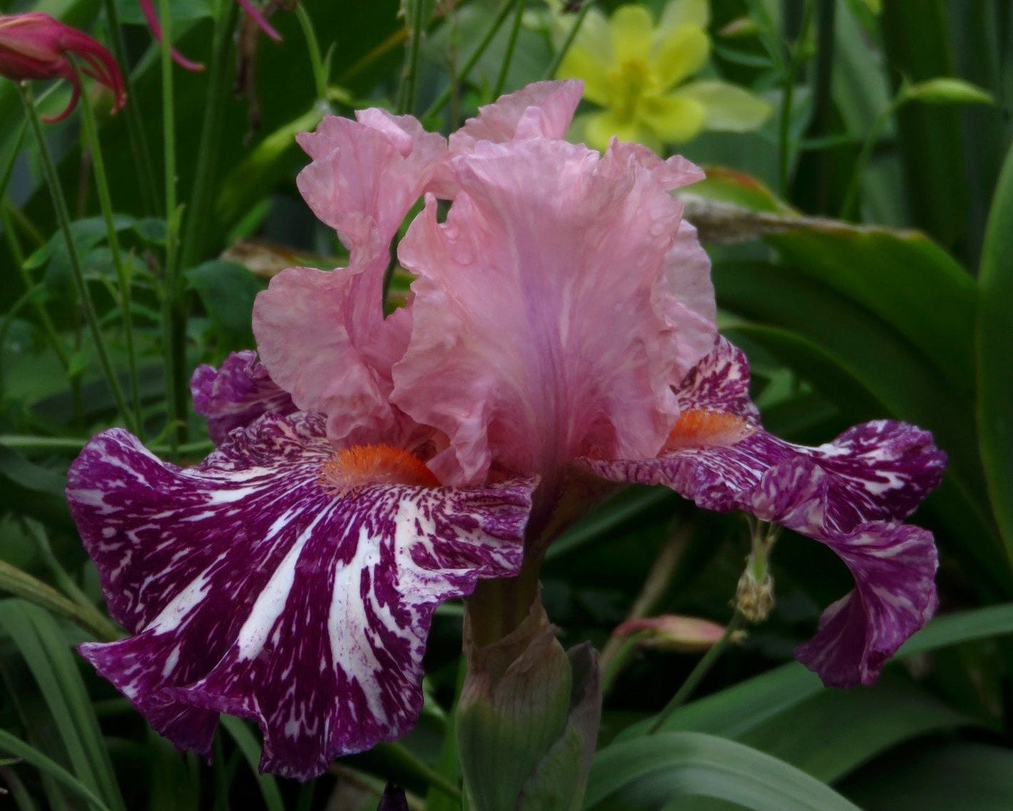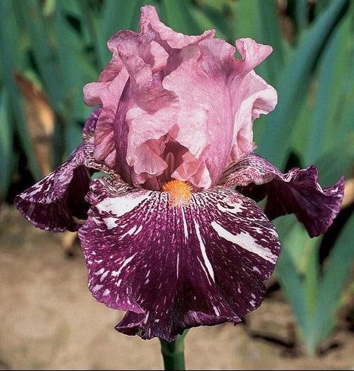 Ruffled pink-beetroot purple bitone overlaid with silvery streaks and blotches. Slightly fragrant.