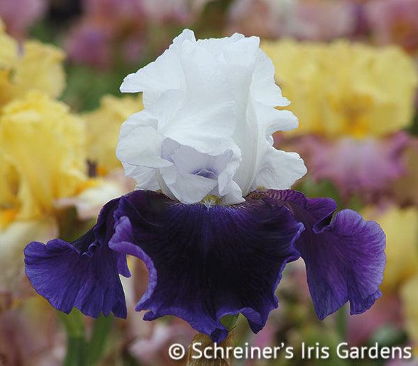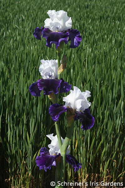 A stunning, near black and white amoena that will hold your gaze. See how the blue-purple undersides and edging introduce a helpful, complementary color. Pristine white standards lend a sharp counterpoint to the regal, dark falls. Bet the Farm’s delightful ruffling, 10 flowers per stalk, and fragrance will insure a rich reward.