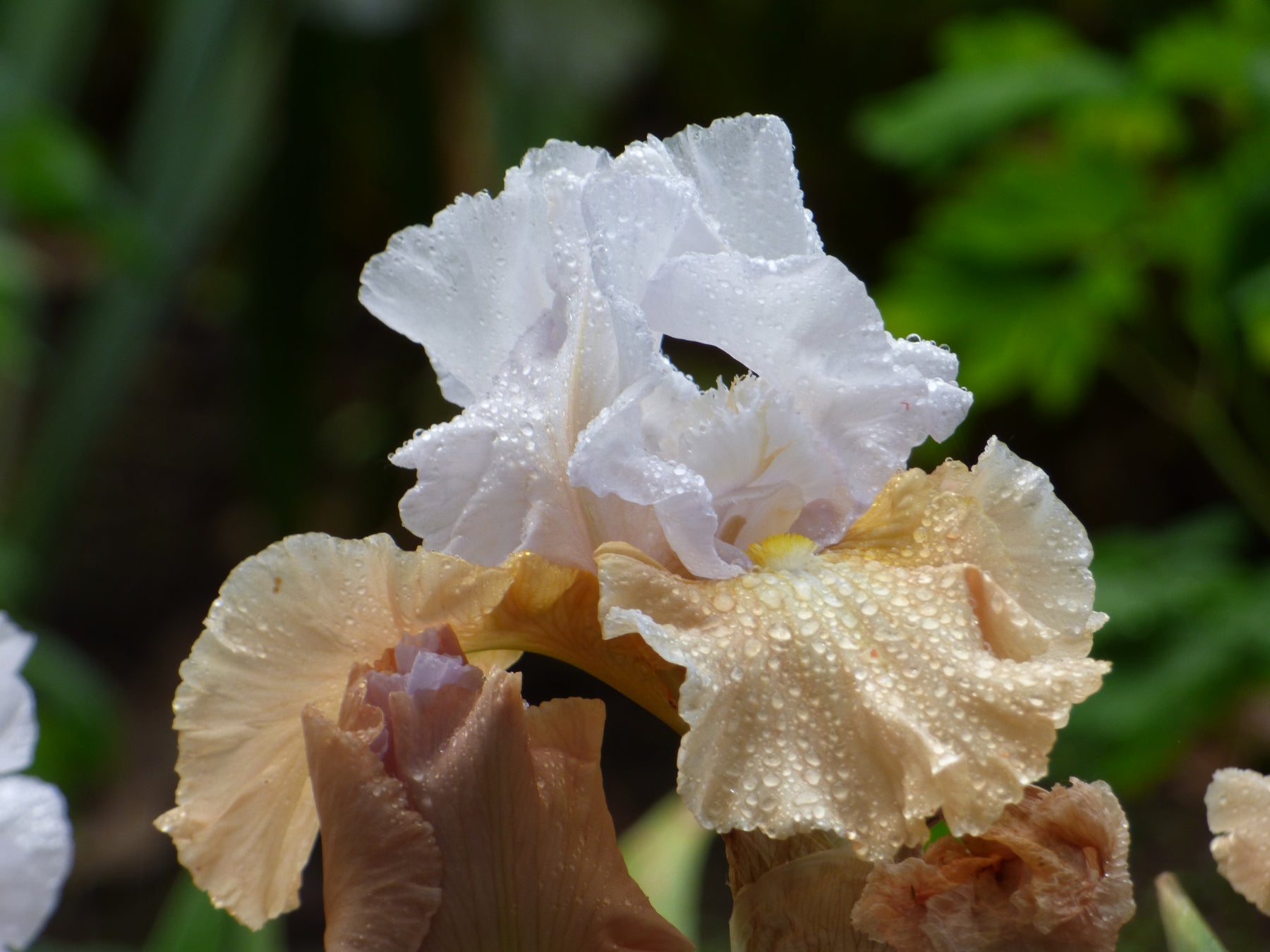 Tall Bearded Iris: Connoisseurs of fine Iris recognize this delicately shaded apricot amoena as one of the best. Its near-white standards are classically arched while its ruffled falls present a gentle blending of buff, apricot and peach. A prolific bloomer, Champagne Elegance produces 7-10 buds per stem and consistently reblooms in late summer. Sweet orange blossom fragrance.