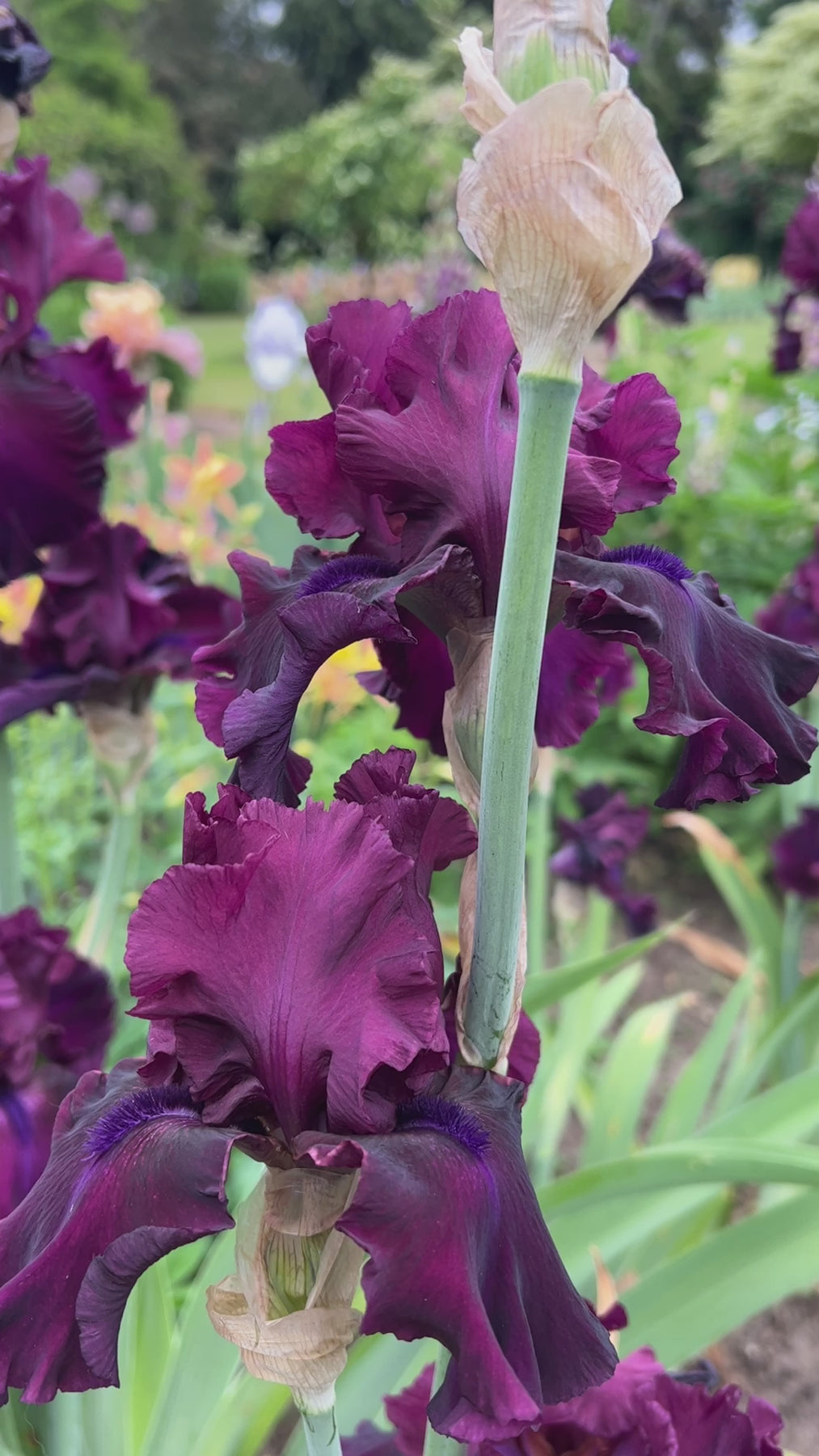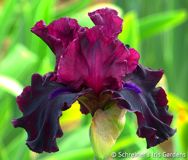 Passionate intensity is straining to burst forth. The restless ocean slams with a thundering roar into a hollow rock formation shaped like a punchbowl, inspiring the name for this popular attraction on the Oregon coast. Our Devil's Punchbowl, with its lusty burgundy standards, displays primal colors, cleanly separated. Only the color burgundy could bring up the sumptuousness of the near black falls. In a unifying gesture, the edges of the falls are edged burgundy. Most surprising are the blue/purple beards. See our photo of this diabolical spellbinder. This robust variety sports 8 buds on 37" spikes.