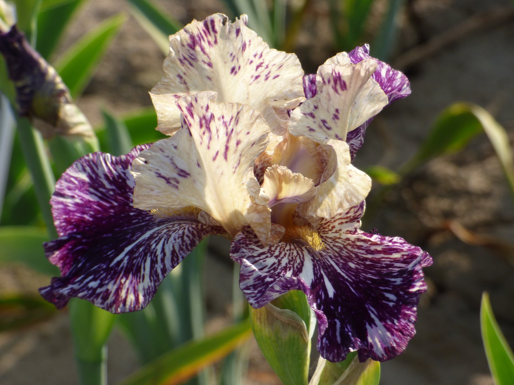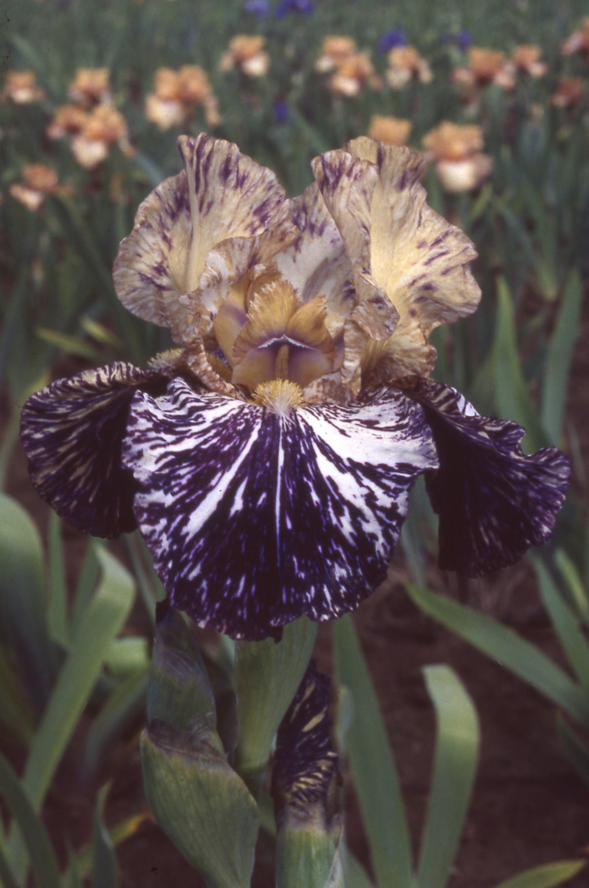 Gnus Flash announces the excitement of the broken color pattern in Bearded Iris, coupled with an unusual color combination. Wild silvery white streaks irregularly visit the grayish tan standards and grape falls. With this distinctive color and good growth habits it has been quickly praised.