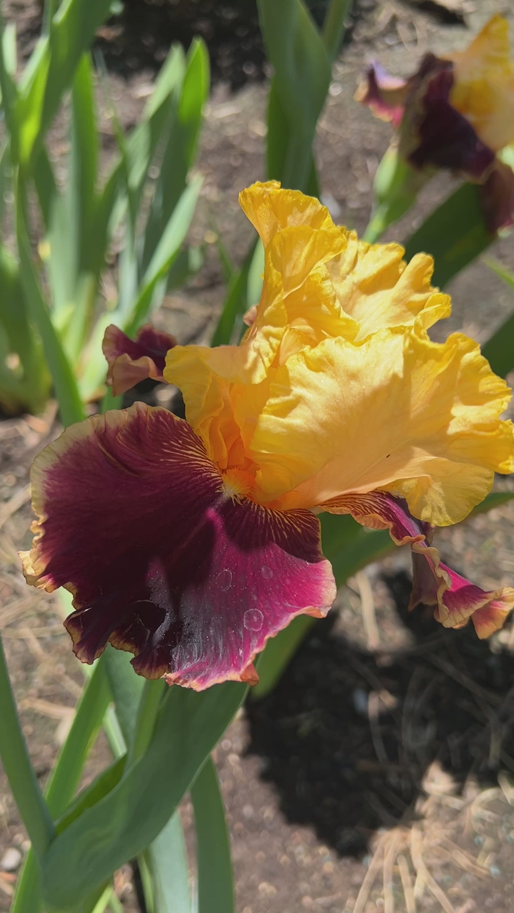 Here we have a bright fiesta that is one of the first Tall Bearded Iris to bloom. This variegata has brassy gold standards and rich maroon falls. The perimeter of each fall has a 1/4" band of bronze-gold at its edge, which is the same color as the standards. A good grower, Mexican Holiday yields many more flowers on three branches often having 11 buds per stalk.
