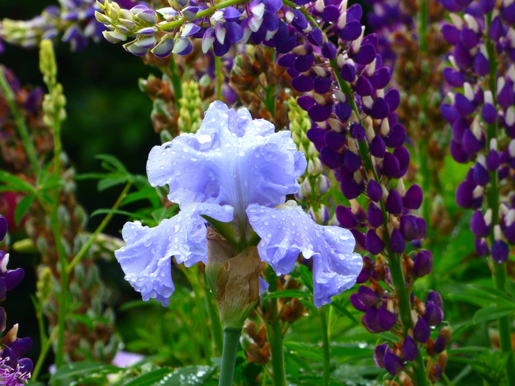 Famous for the range of blue colors, tall bearded iris' most popular one undoubtedly is sky blue, a color rare in the floral kingdom. Typical of the best sky blues, Nestucca Rapids makes a breathtaking impact. Its crisp standards, style arms and crinkled falls are uniformly azure blue. A soft yellow beard and zonal spot barely makes a ripple in the blue rapids, as shown in our photo. Nestucca Rapids blooms 8 big blossoms on 3 - branched stems. This offspring of Blue Temptation and Silverado well represents the beauty of its namesake, one of Oregon's noted rivers.