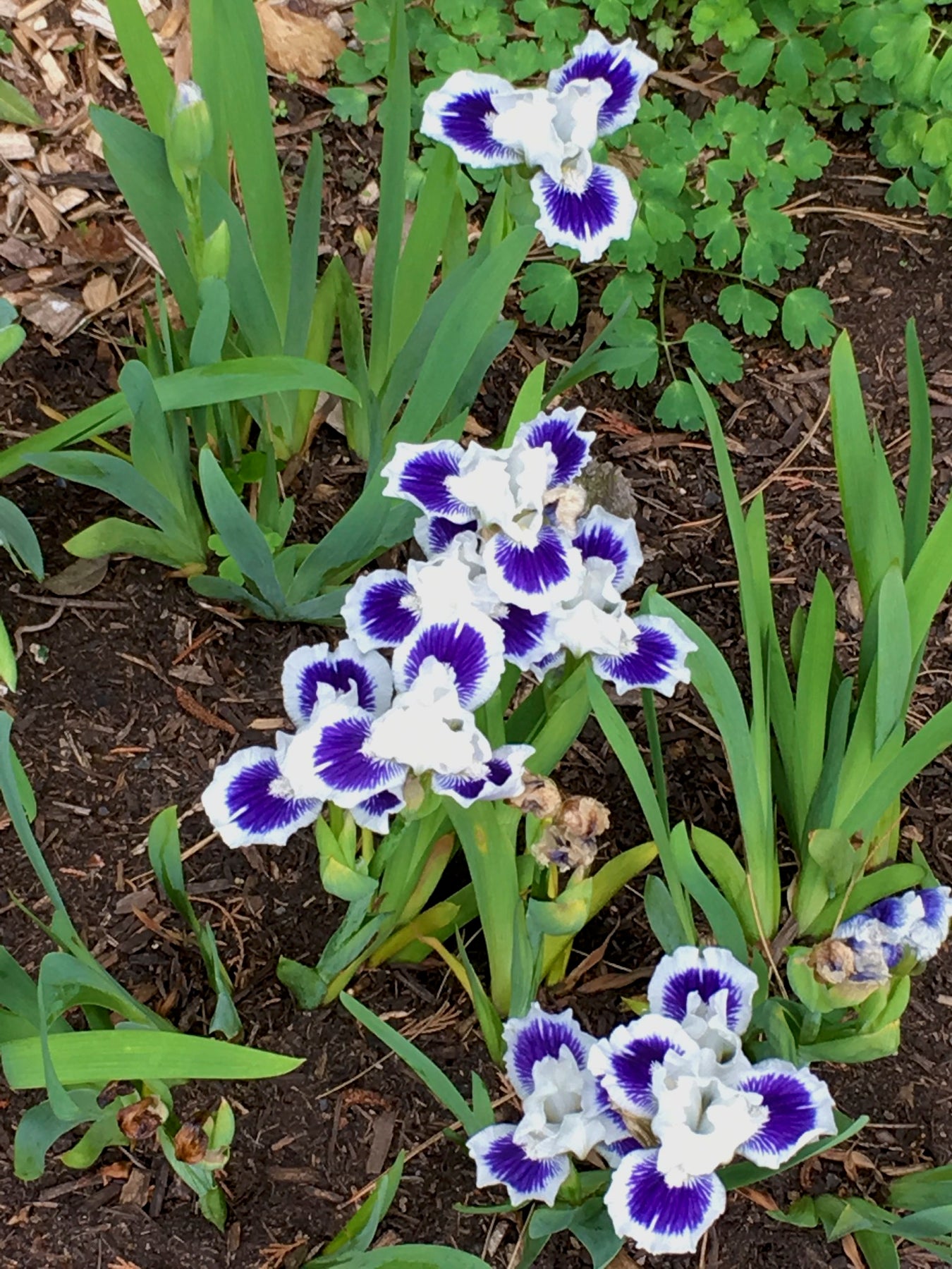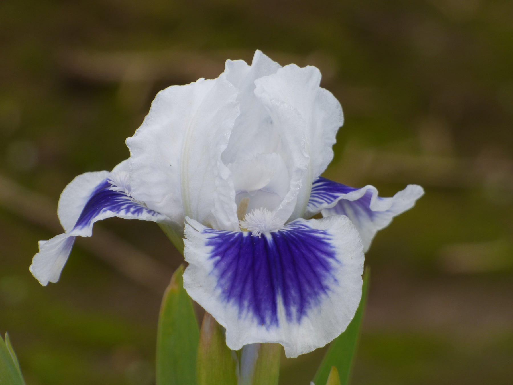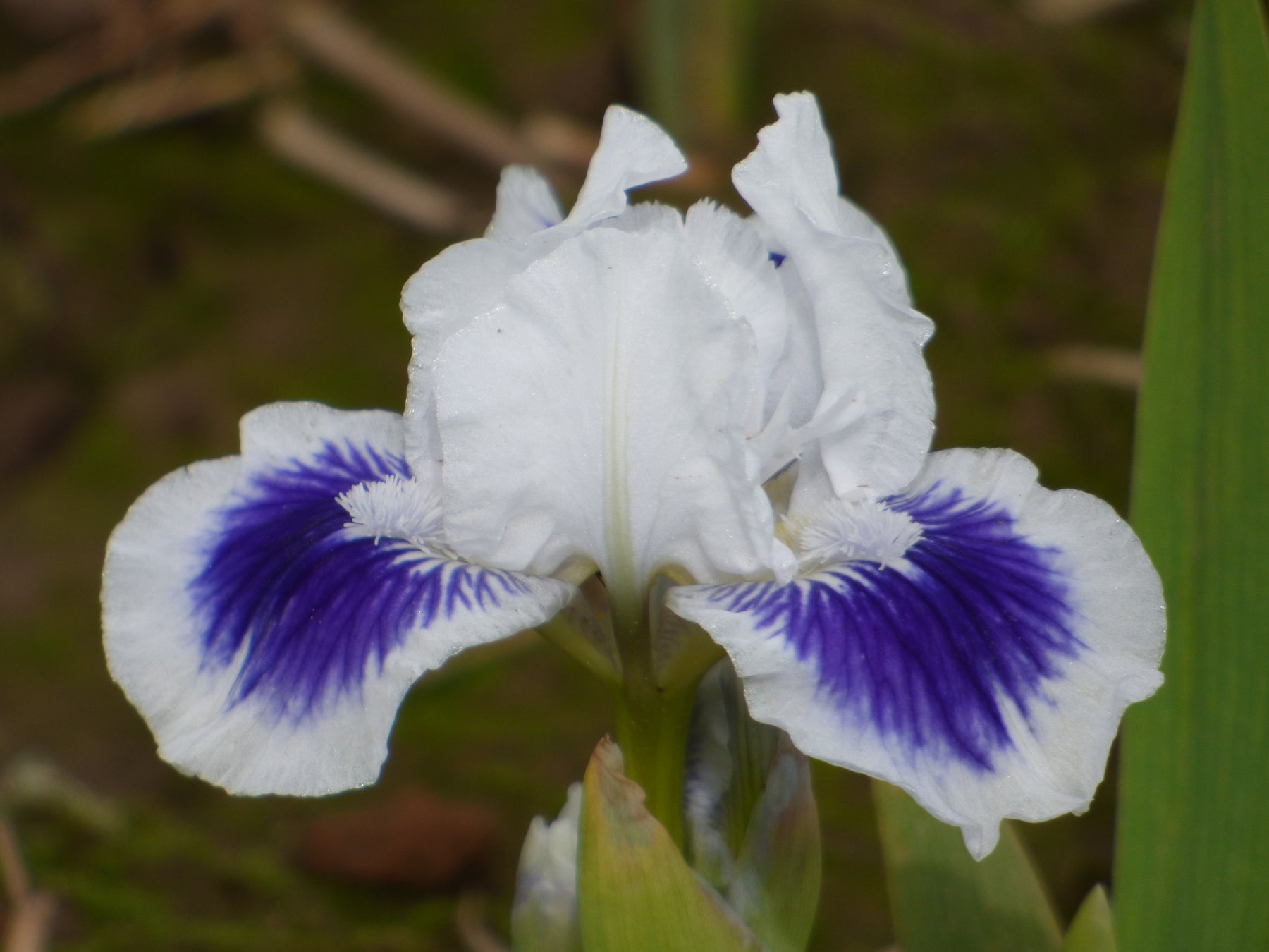 Standard Dwarf Bearded Iris: Standards and style arms bright white; falls white with large irregularly blended inky dark-blue spot; beards white; pronounced sweet fragrance.