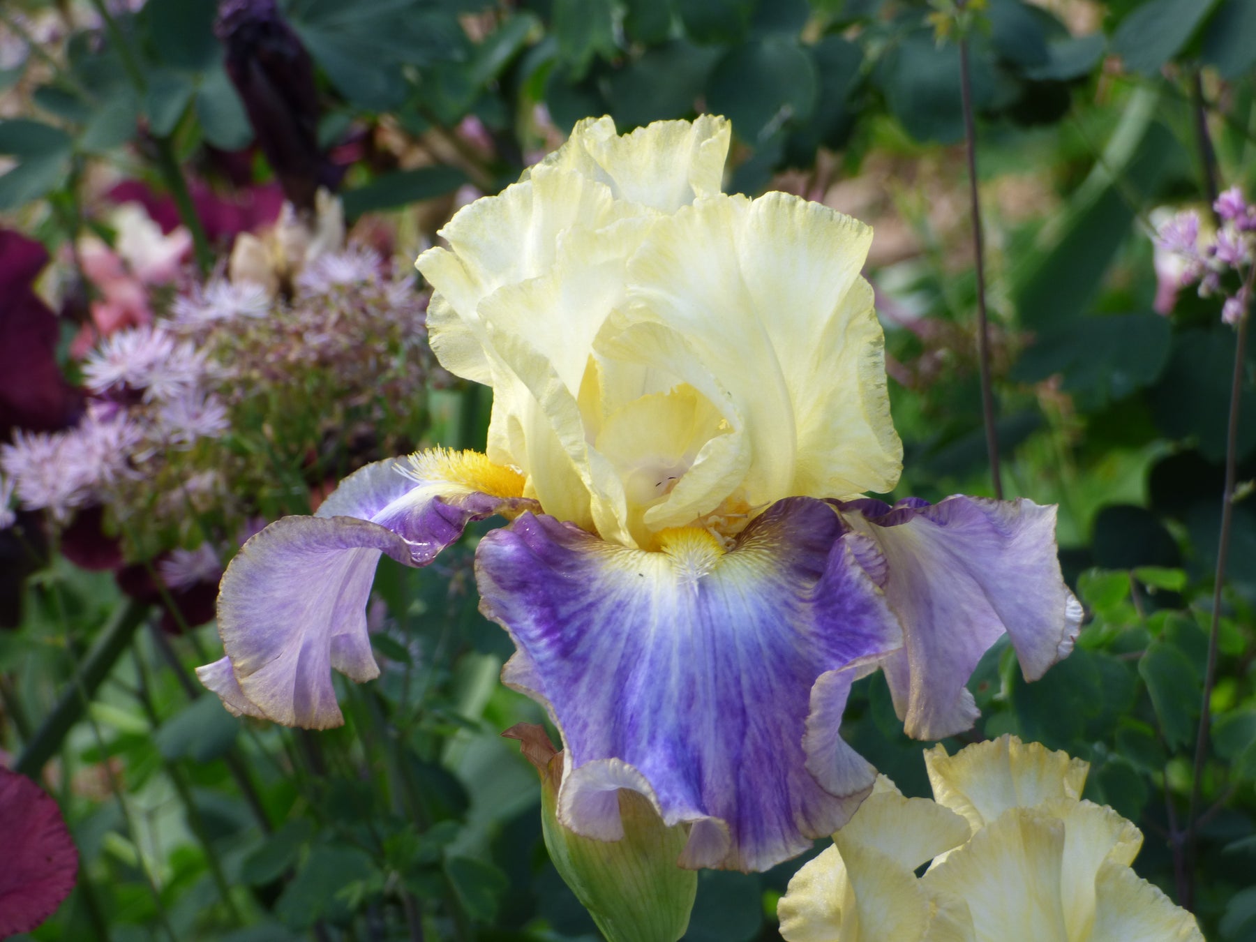 See in our photo the eye-catching chartreuse yellow starburst, and how it permeates the wisteria purple-wash falls. A tawny, sinuous edging encircles broad falls on this statuesque bicolor. Exuberant well-formed standards are the same color as the starburst. Fragrant and well-branched with plenty of buds, Sunny Glitter displays shining evidence of its enduring ancestor Jazz Solo.