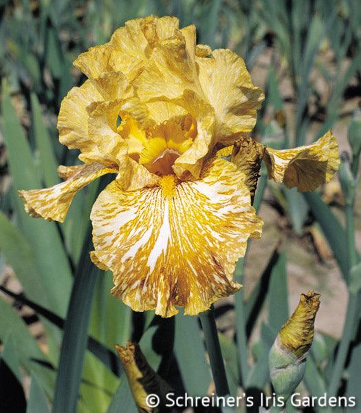 This hybridizer gained recognition for his work with wildly imaginative color patterns. See for yourself, Tiger Honey is one of his best. Its butterscotch standards are randomly streaked in golden yellow. Its lightly laced and ruffled flaring falls are fabulously striped in streaks and blotches of mustard yellow, tan and white. Not to be overlooked is its strong growth.