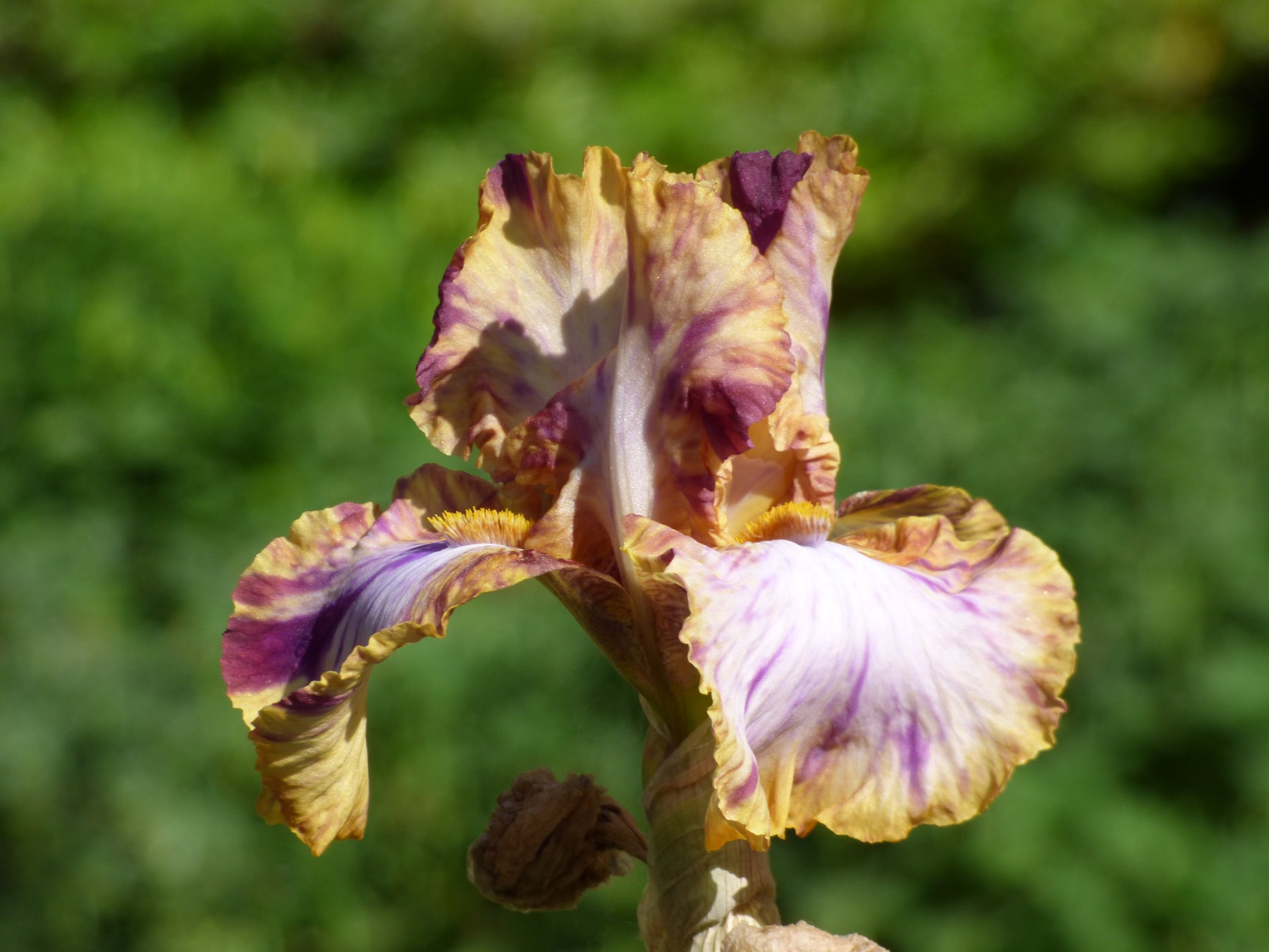 The mustard yellow color of Toucan Tango's petals lightens to cream at their centers. Variable violet-purple streaks randomly cover the slightly ruffled petals. This broken-colored beauty is gifted with a slight fragrance and a strong growth habit.