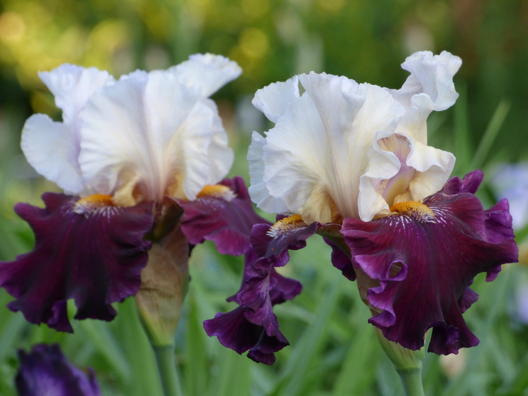 Note in the photo here how a light lavender hue permeates the edges of the bone white standards, theatrically embellished with a shimmering flaxen mist. Golden stylearms add ebullience. Falls contrast sharply with a plush, violet sheen, becoming lighter on the border. Well-branched stems produce 7-9 flowers. A fine orange beard and signature white shoulders mark Twist of Sheree for your next garden cocktail.