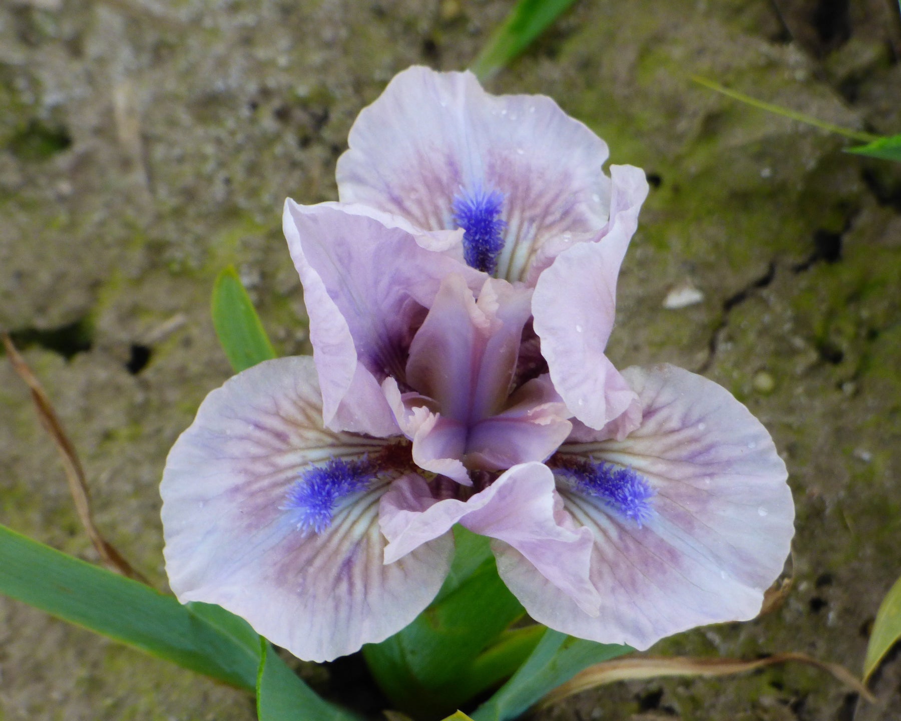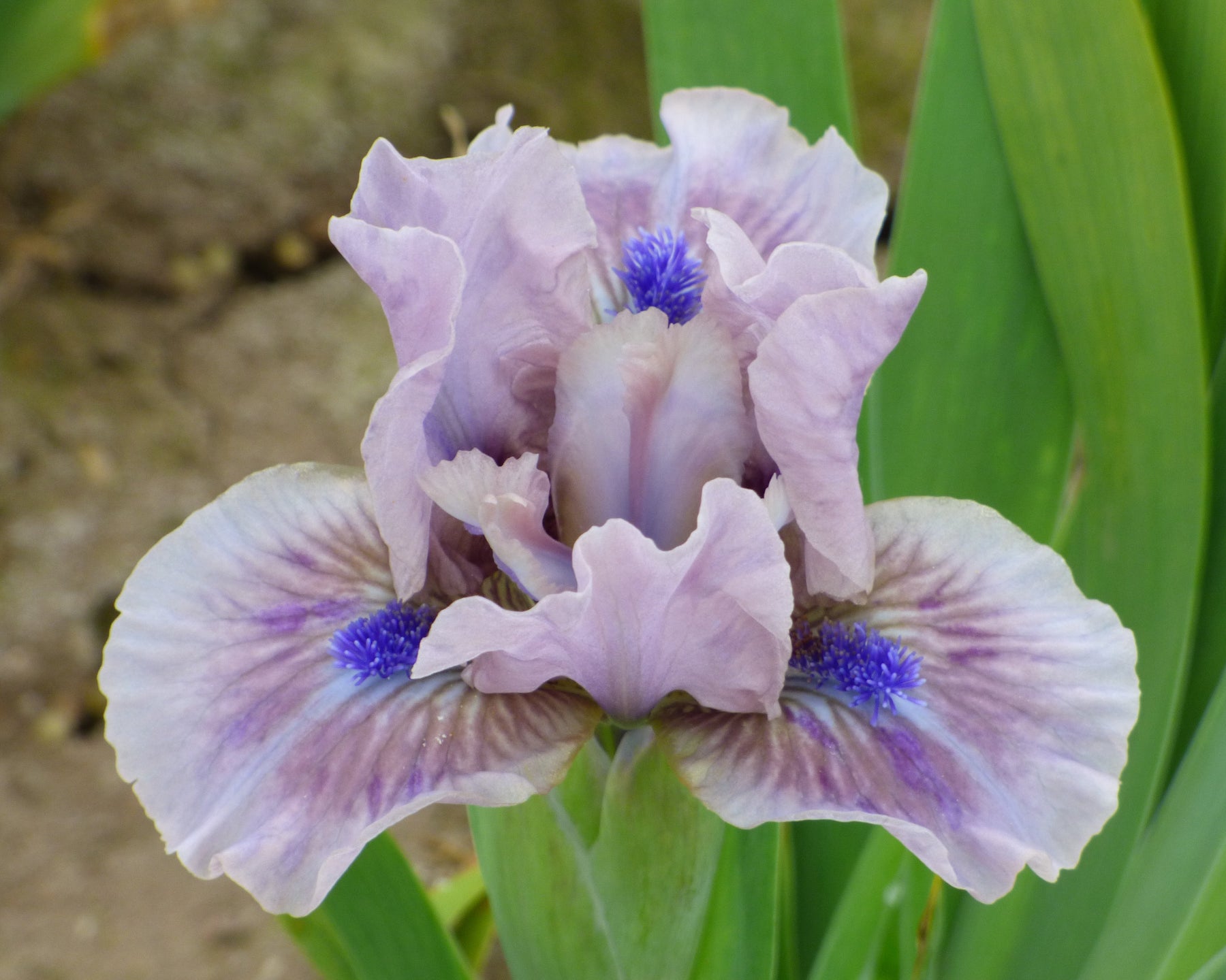 Standard Dwarf Bearded Iris: Standards lavender-grey. Falls same, rose-tan area on each side of beards; beards bright lavender to navy.