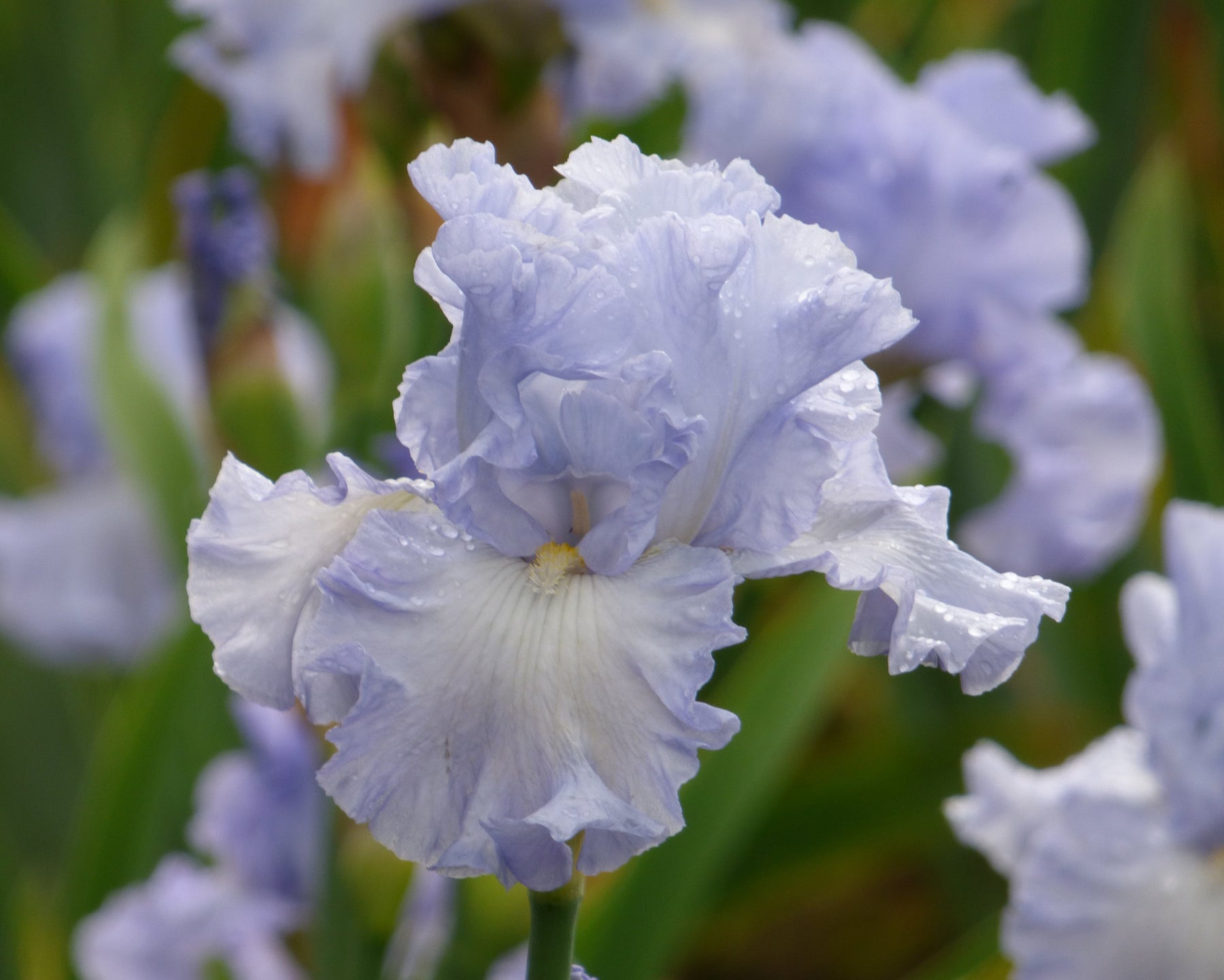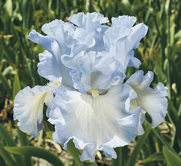 This gem bespeaks Abundance!  There is a fullness, a healthy bursting forth, in this heavily ruffled,  sky blue self.  Standards are sky blue and the falls are slightly lighter in the center. The white beards are tipped gold.