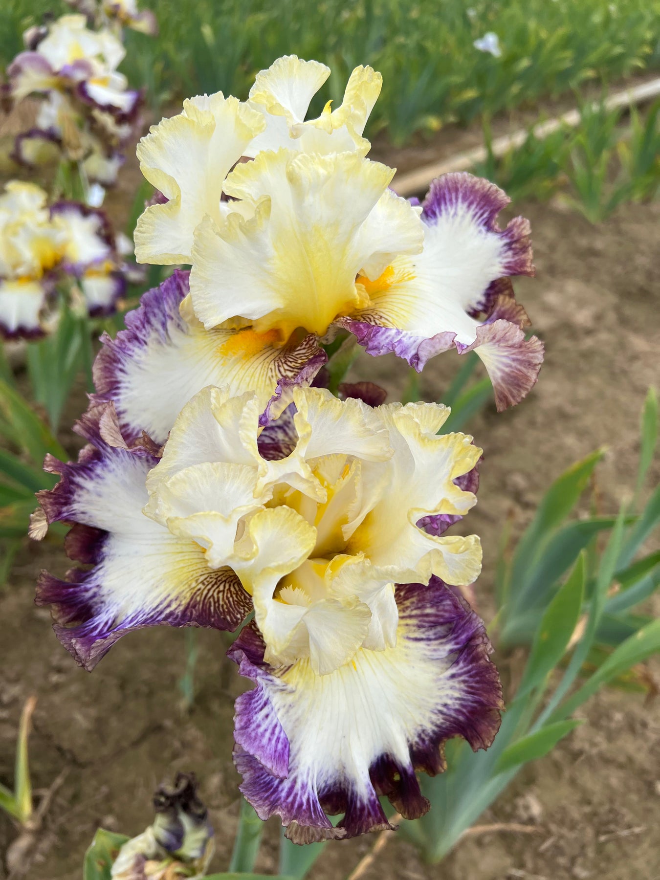 Viewing Final Lap is like experiencing runner’s high. Isn’t Final Lap enjoyably innovative? While deciding how much you like it, you can’t stop staring at it. Two modern color motifs, one for the standards and the other, the falls of course. Both conjoined. Gilt highlighting invigorates the standards. A wide double band of purple, and mahogany brown encircles the white center of the falls, precisely inflected with gold. Growing up, working in our iris fields, hustle (often running) was instilled in us.