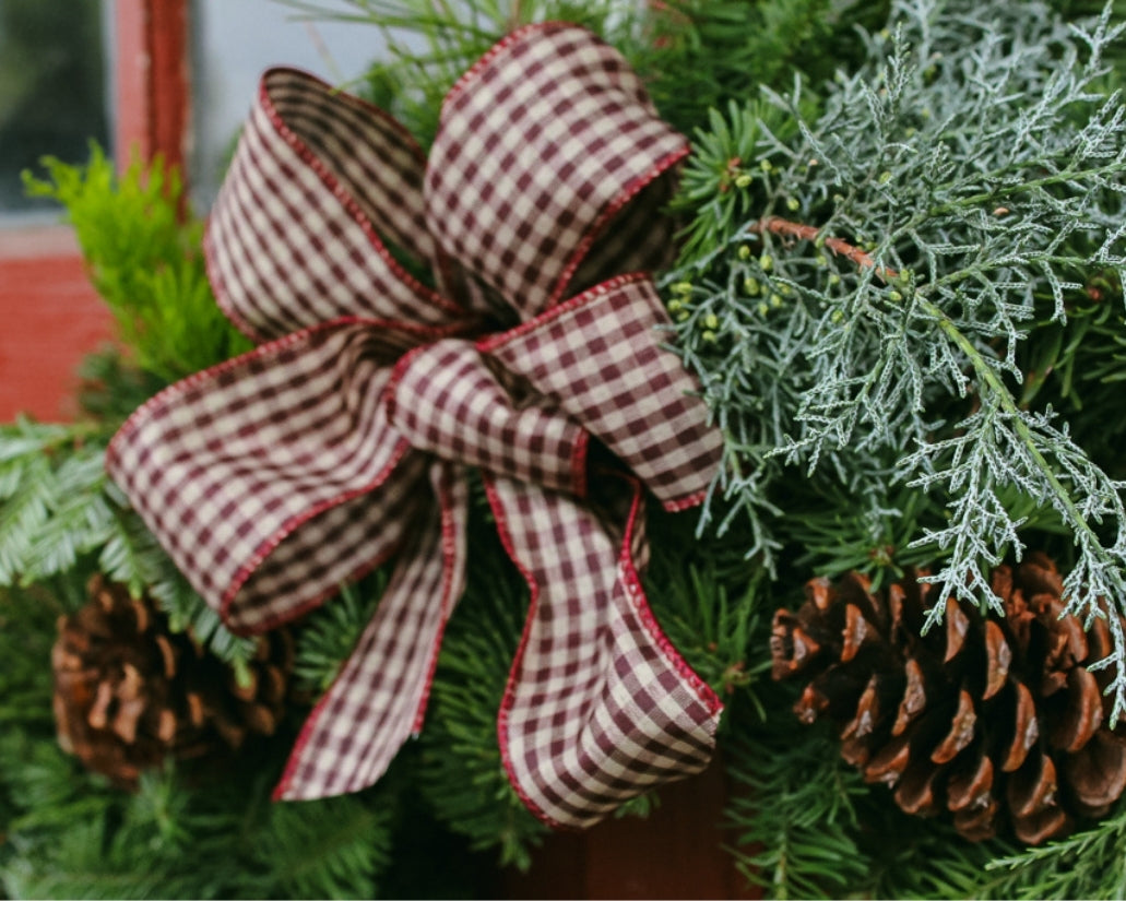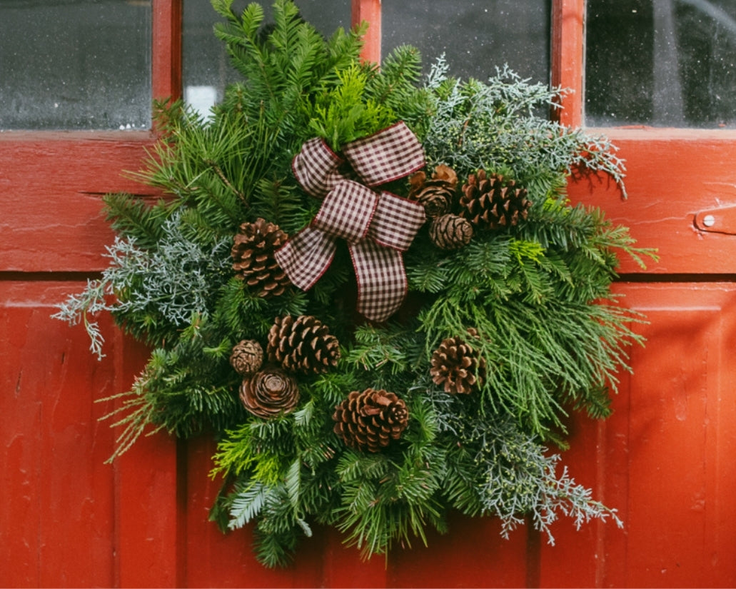 Inspired by the rugged woods of Bend, Oregon, this wreath brings mountain magic to your doorstep. Built from noble fir, pine, redwood, blue and lemon cypress, and accented with fragrant juniper berries, it captures the crisp scent of winter in the high desert. Finished with a rich burgundy checked ribbon and pinecones for that cozy, cabin-in-the-woods feel.