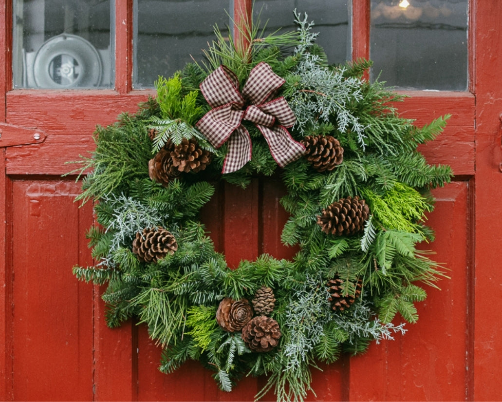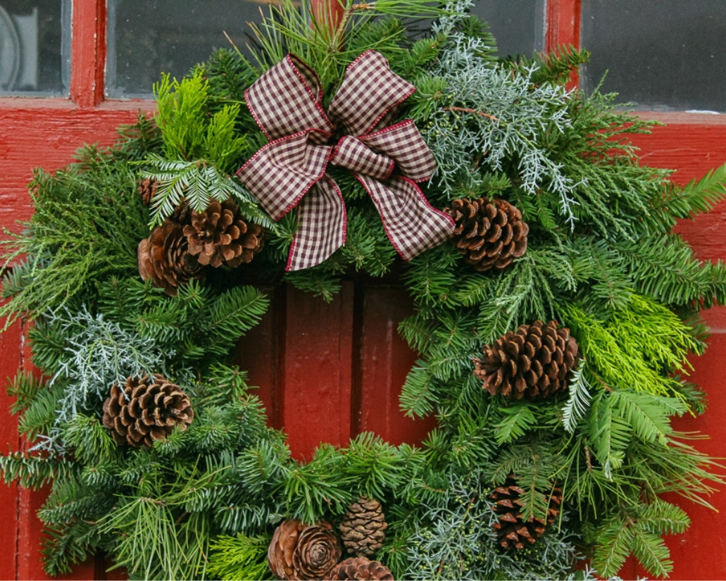 Inspired by the rugged woods of Bend, Oregon, this wreath brings mountain magic to your doorstep. Built from noble fir, pine, redwood, blue and lemon cypress, and accented with fragrant juniper berries, it captures the crisp scent of winter in the high desert. Finished with a rich burgundy checked ribbon and pinecones for that cozy, cabin-in-the-woods feel.