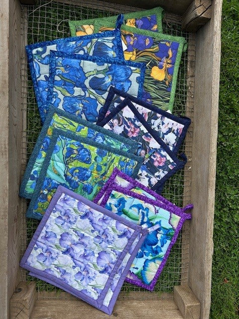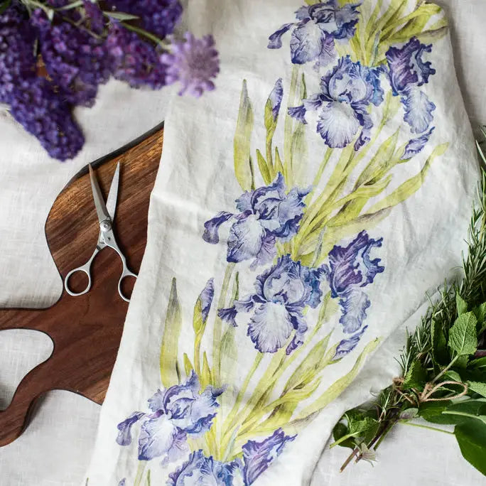 Enhance your kitchen with this delightful bundle featuring a hand-made clay spoon rest with a delicate iris design, an organic stone-washed linen tea towel with a hand-painted botanical watercolor design, and a set of two pot holders made with custom iris fabric. These items combine functionality with artistic charm, providing durable protection for your countertops, reliable heat protection for handling hot cookware, and a touch of unique design to your kitchen tools. Celebrate nature and artisanal quality in your everyday kitchen experience.