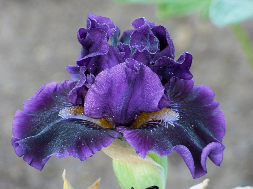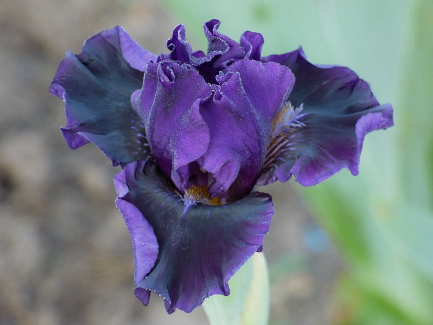 Intermediate Bearded Iris: S. and F. purple/black; style arm crests black-grape; beards white tipped yellow-orange in throat, ends blue tipped brown.