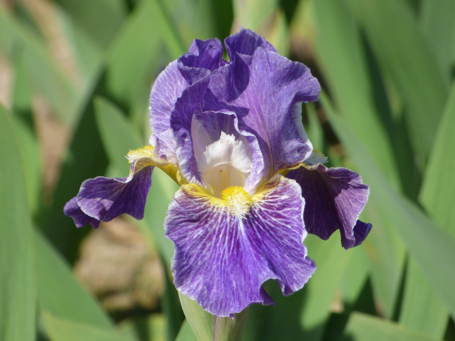 Intermediate Bearded Iris: Standards are white base overlaid violet, thin white rim; style arms white; Falls are dark campanula violet lined white to end, yellow shoulders, thin white rim; beards buttercup yellow in throat, white at end; ruffled; slight sweet fragrance.