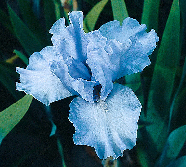 Intermediate Bearded Iris: Clear sky blue self, superb ruffled form.