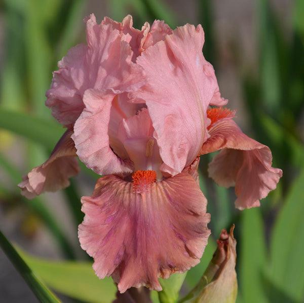 Intermediate Bearded Iris: Soft soft rosy pink; falls rosy pink, light coffee apricot blended overlay, olive wash at hafts; beards vivid tangerine.