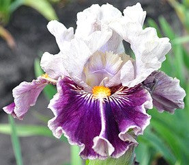 Intermediate Bearded Iris: Standards grey-beige to champagne; falls soft red-violet, with 1/8ƒ?� edge of standard color; beards tangerine over white.
