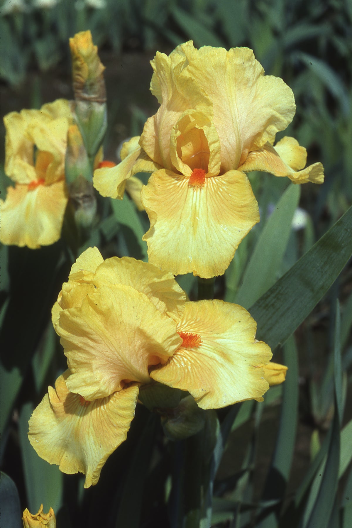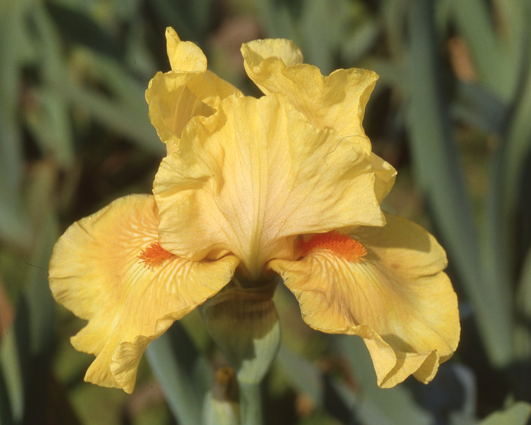 Intermediate Bearded Iris: Deep yellow with tangerine beards.
