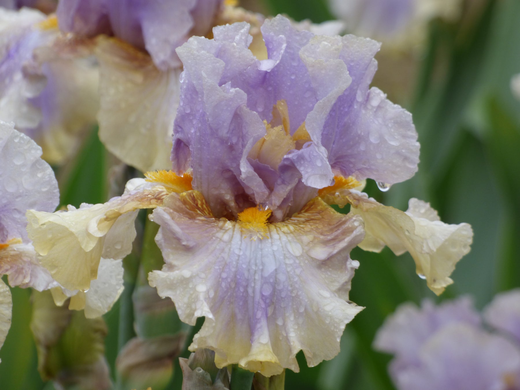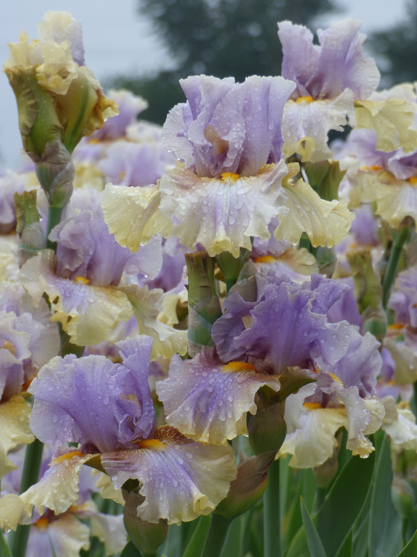 S. lavender, pale yellow at top; F. smoky lavender, center brighter, yellow-green at bottom of petal; beards bright yellow-orange, base white at ends