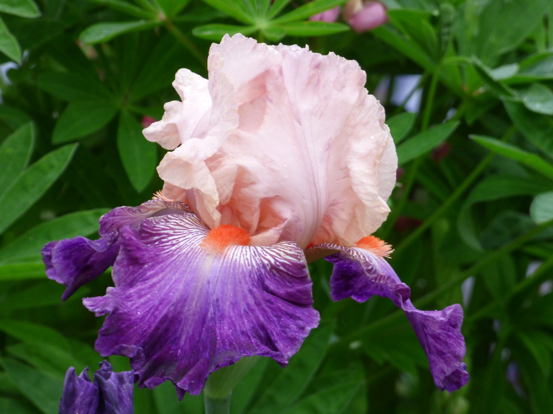 You don't have to be a prince in a fairytale to fall hard for Damsel In A Dress. With boldly contrasting colors, and perfect form, it seems to float above the garden, like a gentle parachute. Violet magenta falls, overlaid with streaking white rays, evocative of its parent, Starship Enterprise, ripple with elan. Seashell pink standards gracefully shelter the fiery orange beards. This vigorous specimen features 7-9 buds on 36 inch stalks and blooms mid- to late season.