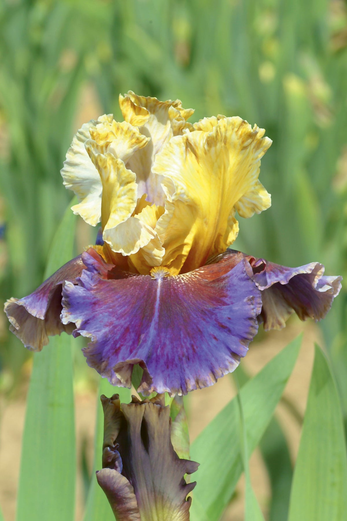 The pale lemon color of Final Episode's lightly laced standards changes to brassy gold at their midribs. The plush violet color of its falls lightens at their edges, accentuating their gentle ruffles. Reddish brown tones overlay the top half of the falls.