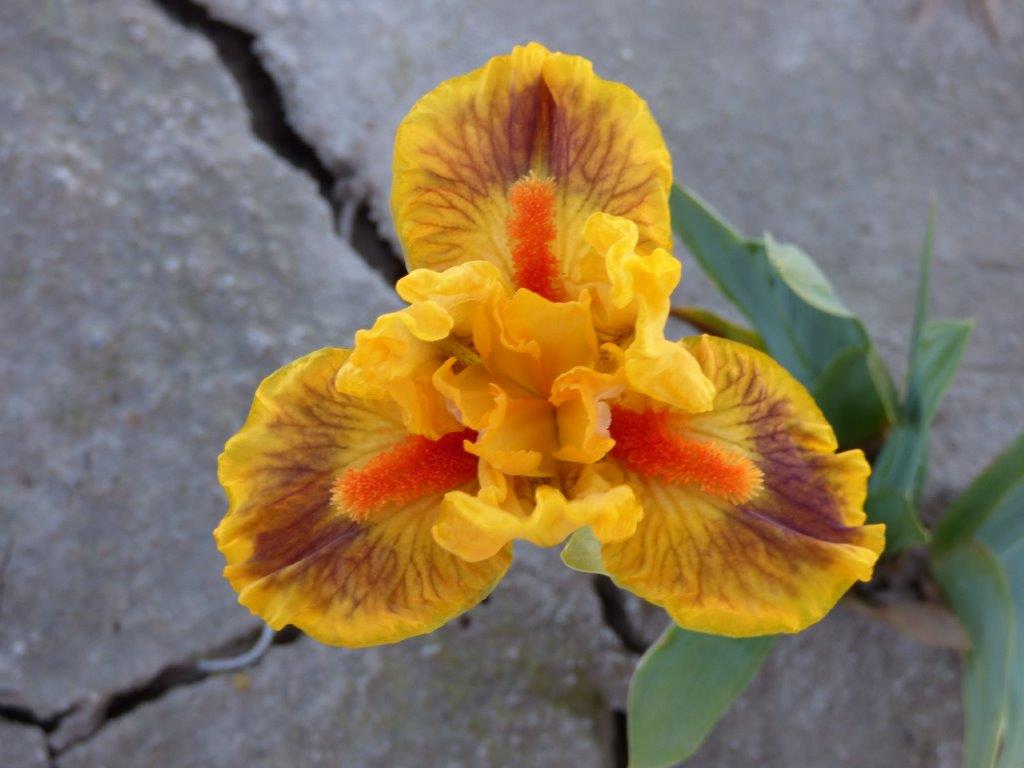 Standard Dwarf Bearded Iris: A sister seedling to Bear's Ears, Hokie throws its own glowing orange beard upon maroon and burnt yellow falls and standards. One can't help but think of the colors of the Hokies of Virginia Tech University.