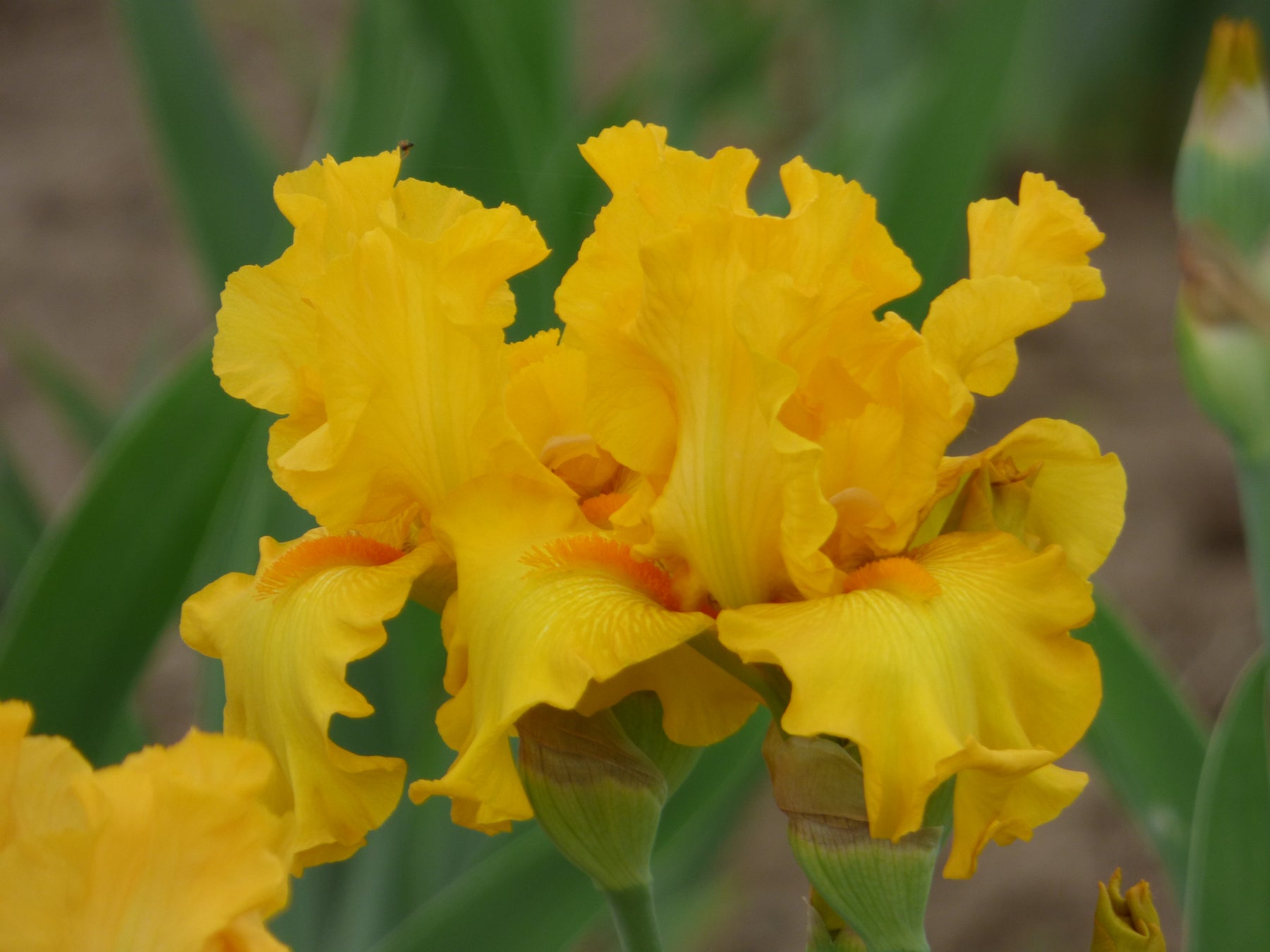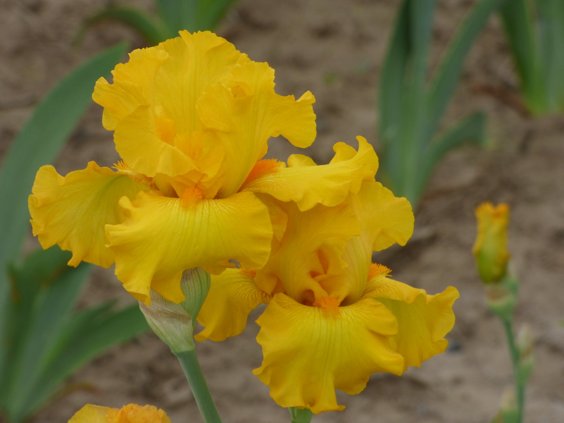 Mille Soleils is a tall bearded iris featuring gold-yellow petals and vibrant orange beards. Its flowers are beautifully formed with gently rippled edges, adding a refined texture to its elegant appearance.
