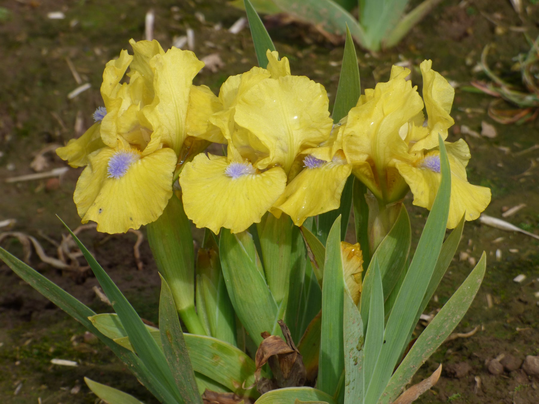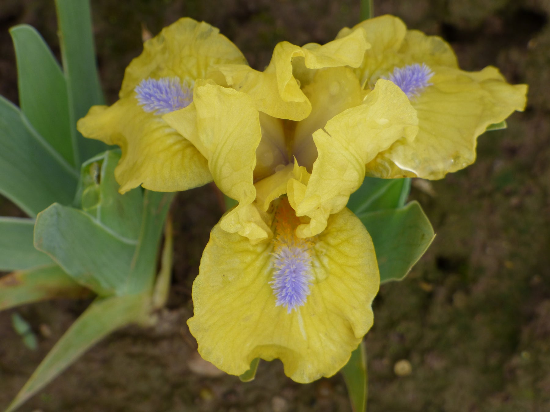 Standard Dwarf Bearded Iris: Yellow self with blue-violet beards.
