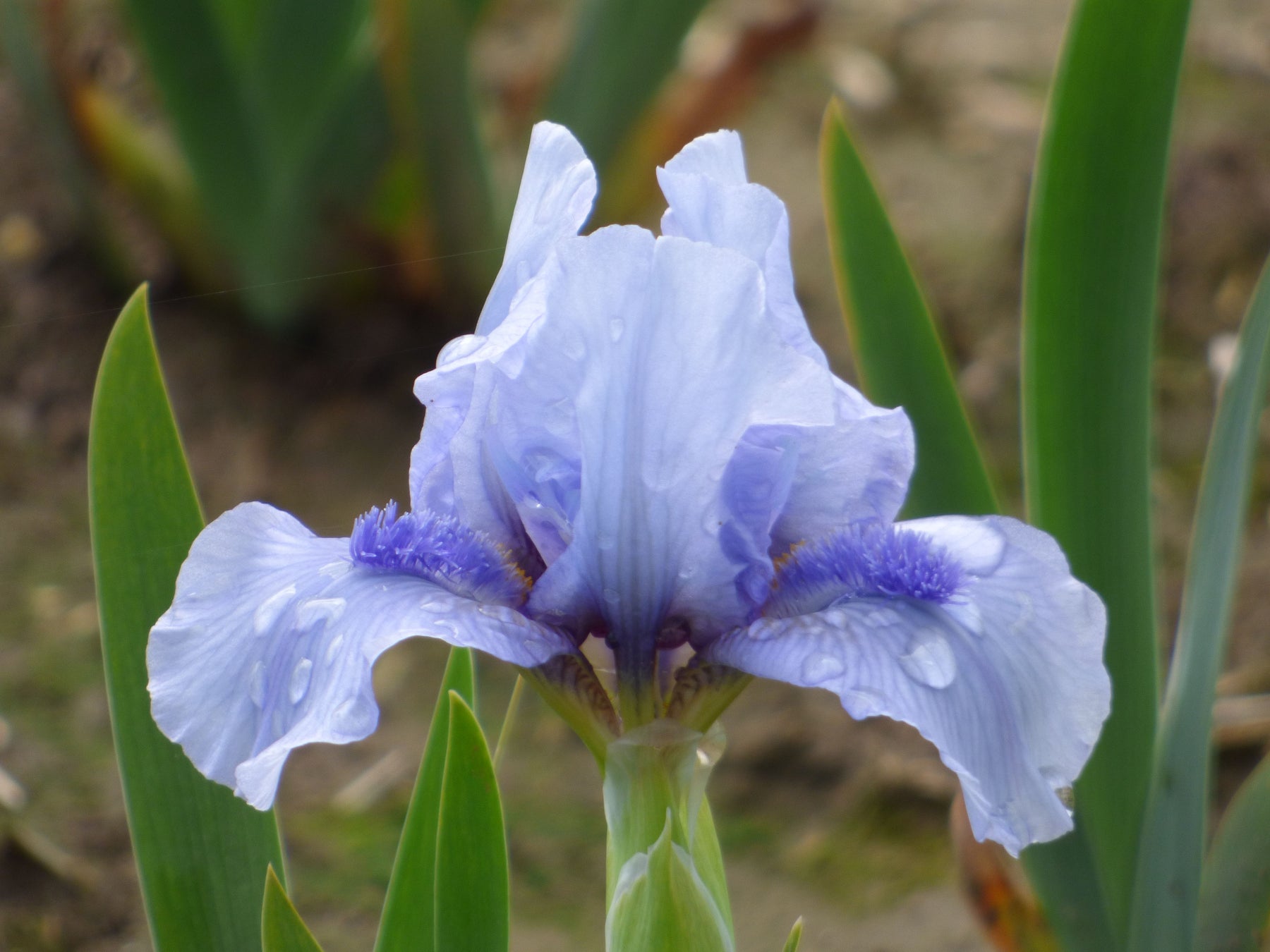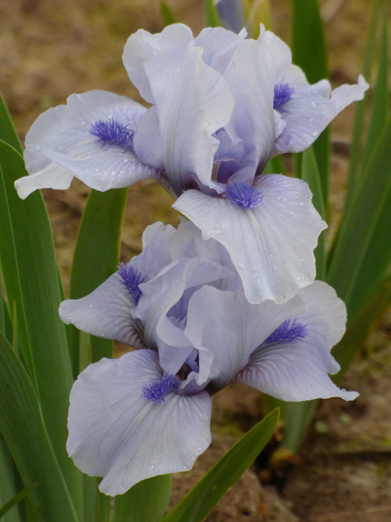 Standard Dwarf Bearded Iris: Light blue with near white spot around beard and grey-blue veins; beards dark blue.
