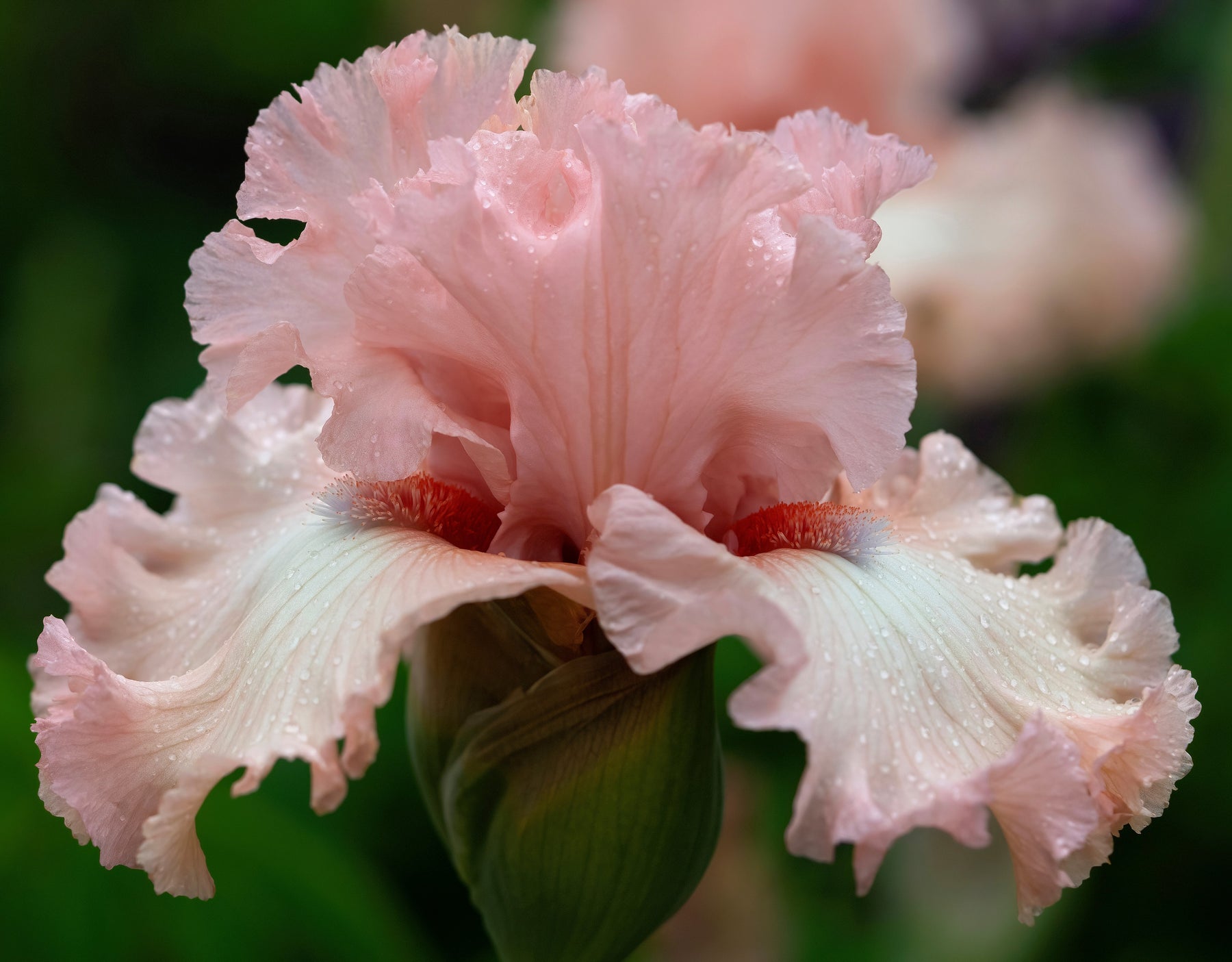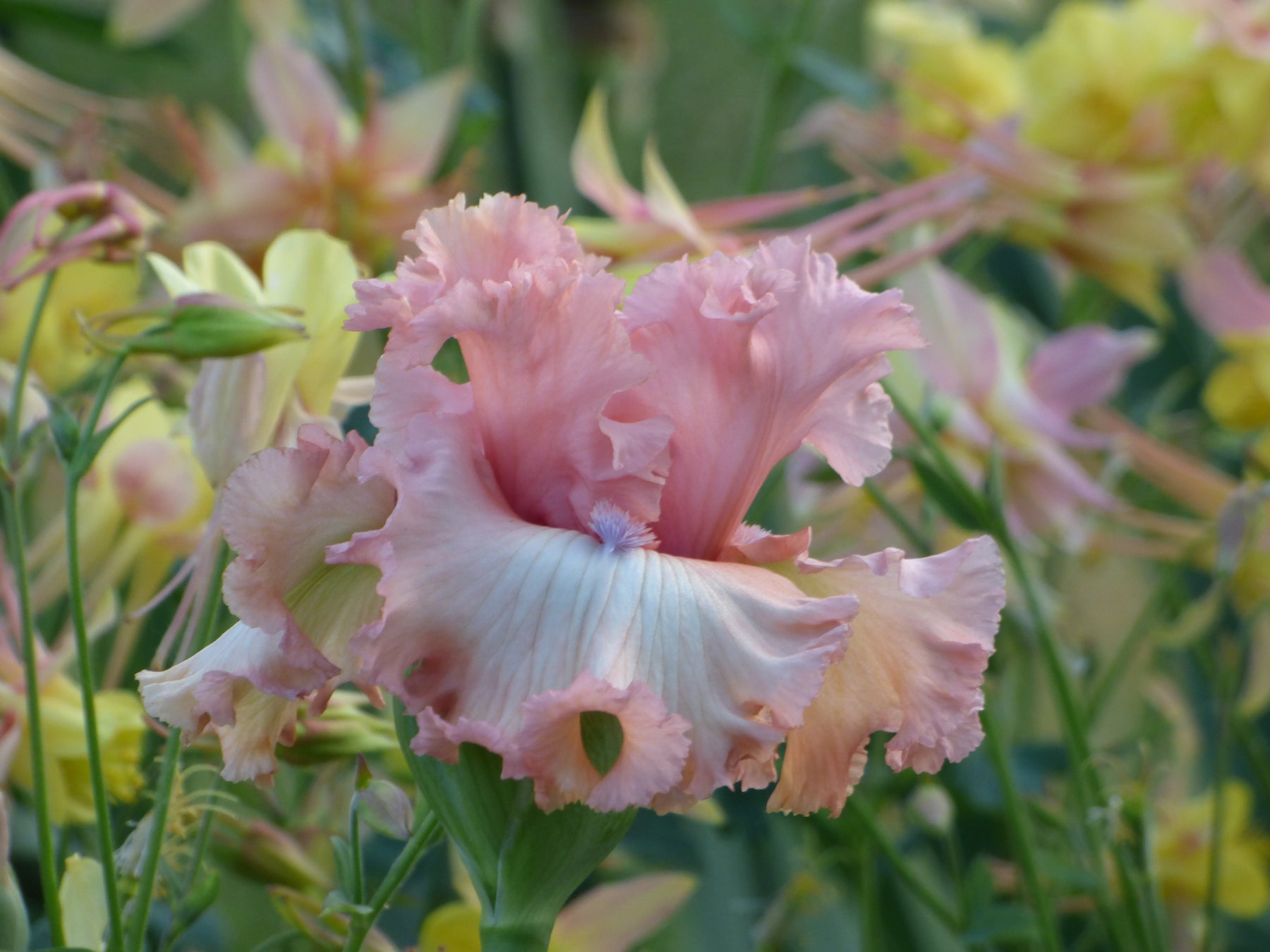 Resistance is futile, akin to fending off Hello Dolly’s enveloping petticoats. Surrender to the inviting warmth of Sugar High’s sweet safrano pink standards and pastel peach falls. Finely punctuating the falls are the subtle green venations overlaying the cream centers. Sugar High is copiously ruffled and has felt-like substance. Obvious in the pedigree is the well-known Strawberry Shake. The startling difference in the two is - Sugar High is 40” high. On first glance, even the hardest heart will begin to melt.