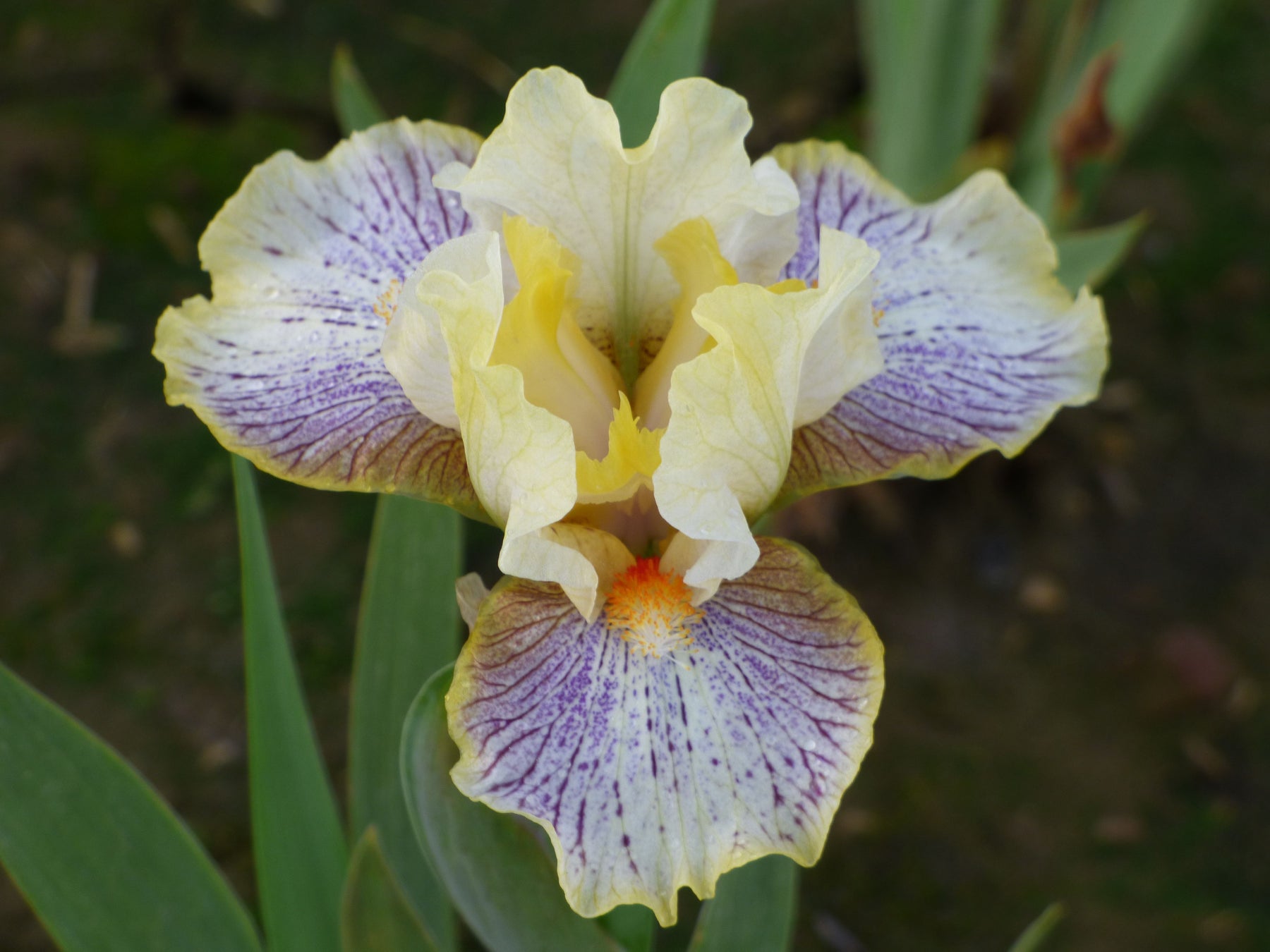 Standard Dwarf Bearded Iris: S. white to pale yellow; F. yellow overlaid w/violet plicata wash; beards white w/yellow tips.