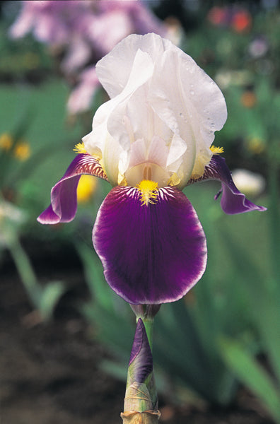 We are proud to offer Wabash, a truly historic Iris. Its simple tailored form speaks with a quiet elegance. The clean white standards offer good contrast to the deep plush reddish purple of its falls. Note also the delicate white wire rim on the edges of the falls.