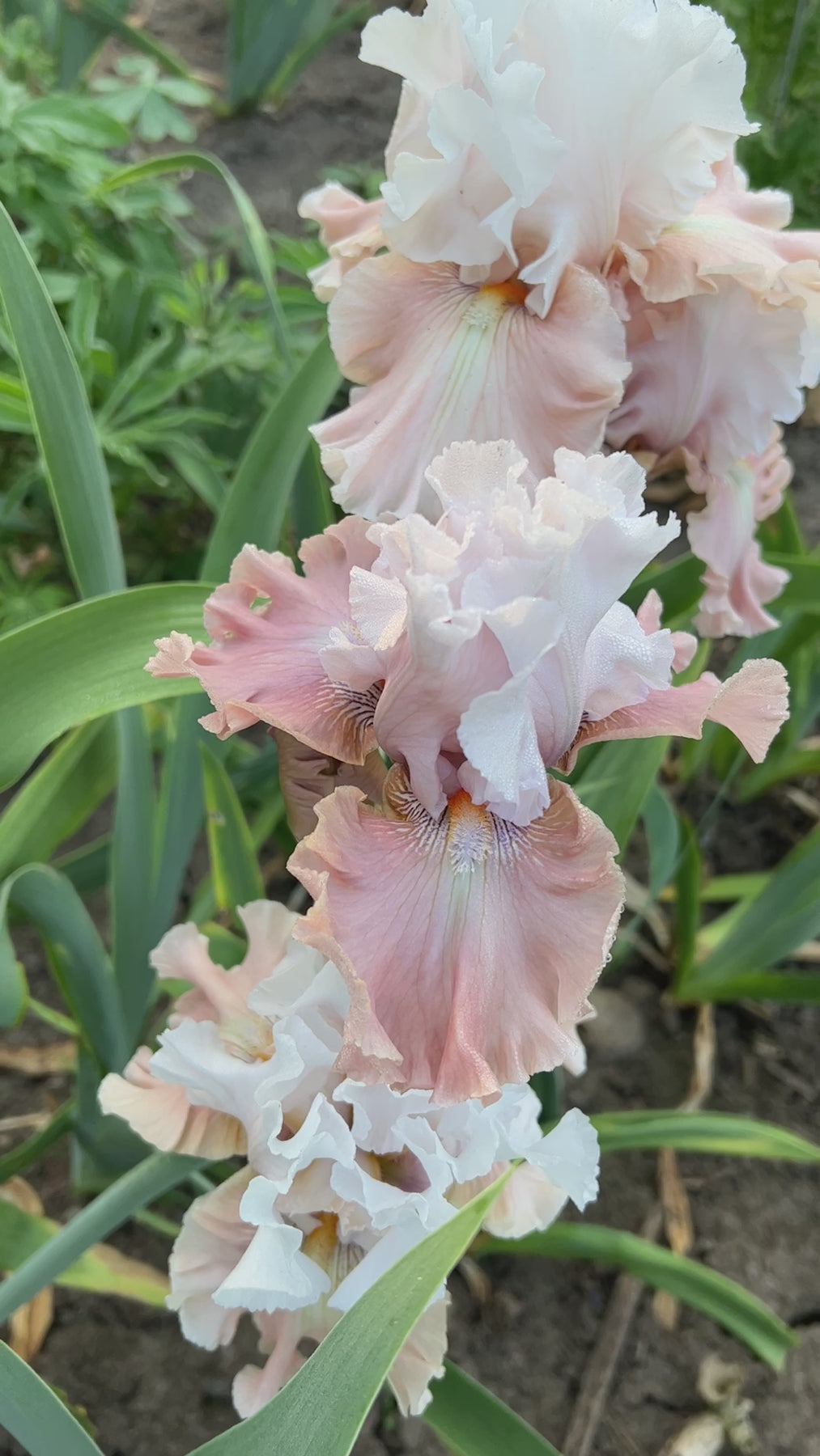 Noticeable Ghio-formed pink amoena. Tight domed standards of white with shadow of pink at the base. Falls are an even shell pink with lilting bubble ruffling. Tangerine beards, tipped white. Nicely branched and budded. Note this unique approach to pink amoenas.