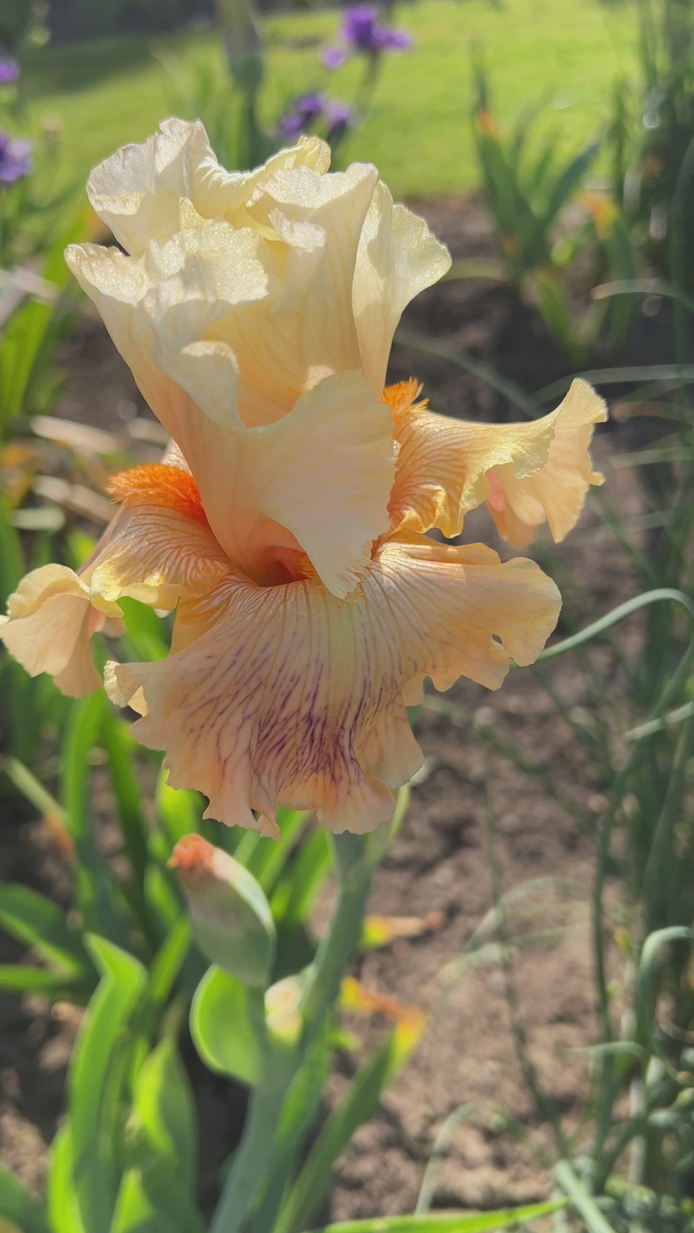 A unique buxom beauty with form! Note the very large blooms with wide, overlapping petals, displayed elegantly on strong, gently curved stems. Domed standards are white, coral at base and up the mid-rib, with a hint of yellow-apricot halo around the petal edge. The styles repeat the standard colorings. The very wide overlapping haft falls are golden apricot with a light violet line and speckles from the center of falls, deepening to the rim. Tangerine beards complete this striking origination.