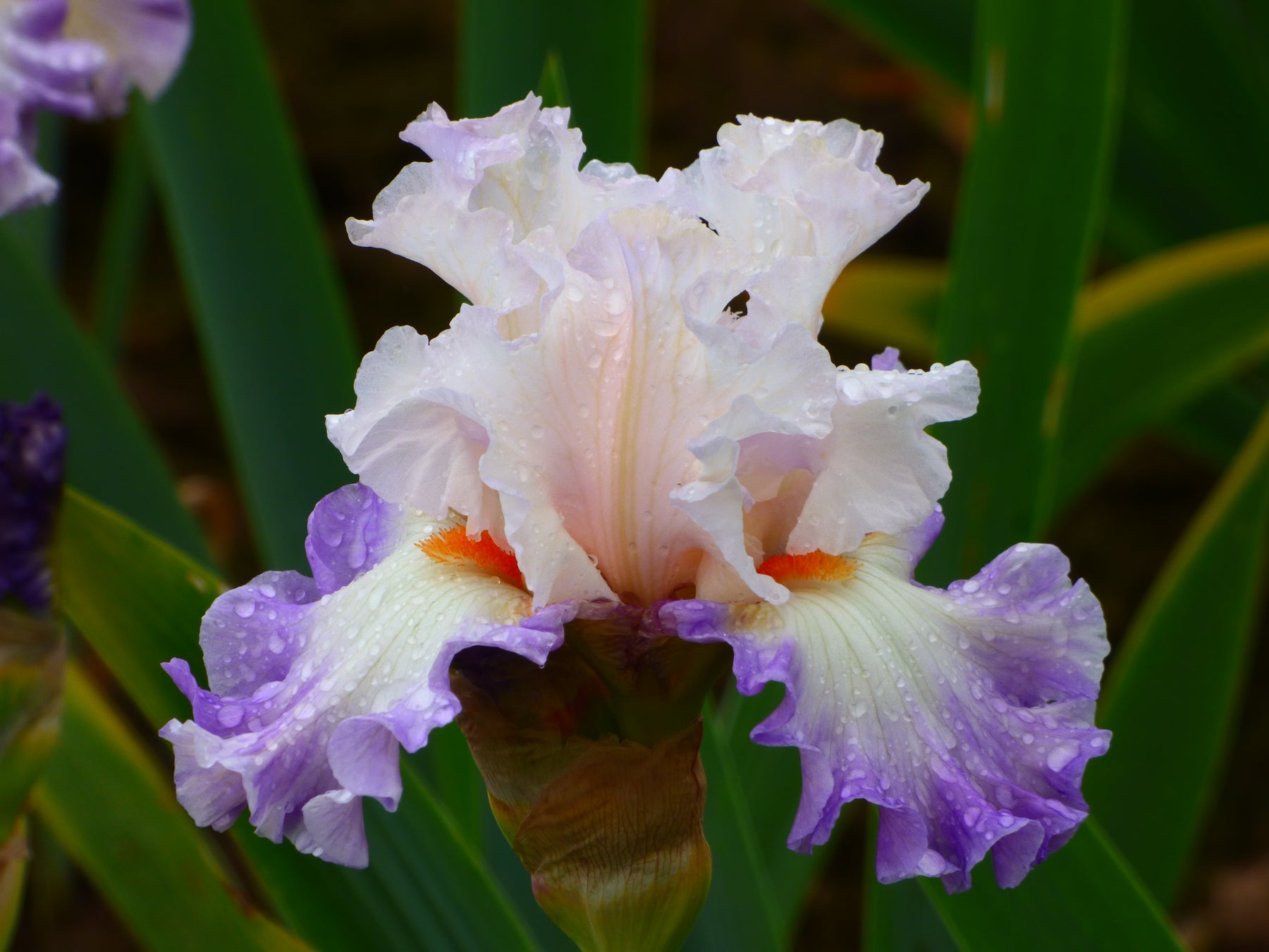 Polite Applause style arms ineffably reflect the becoming pastels of the falls. Very pale pink curlicued standards mutually enhance corrugated falls. Glowing tangerine beards illuminate the soft, purple - edged falls. Give it a hand.