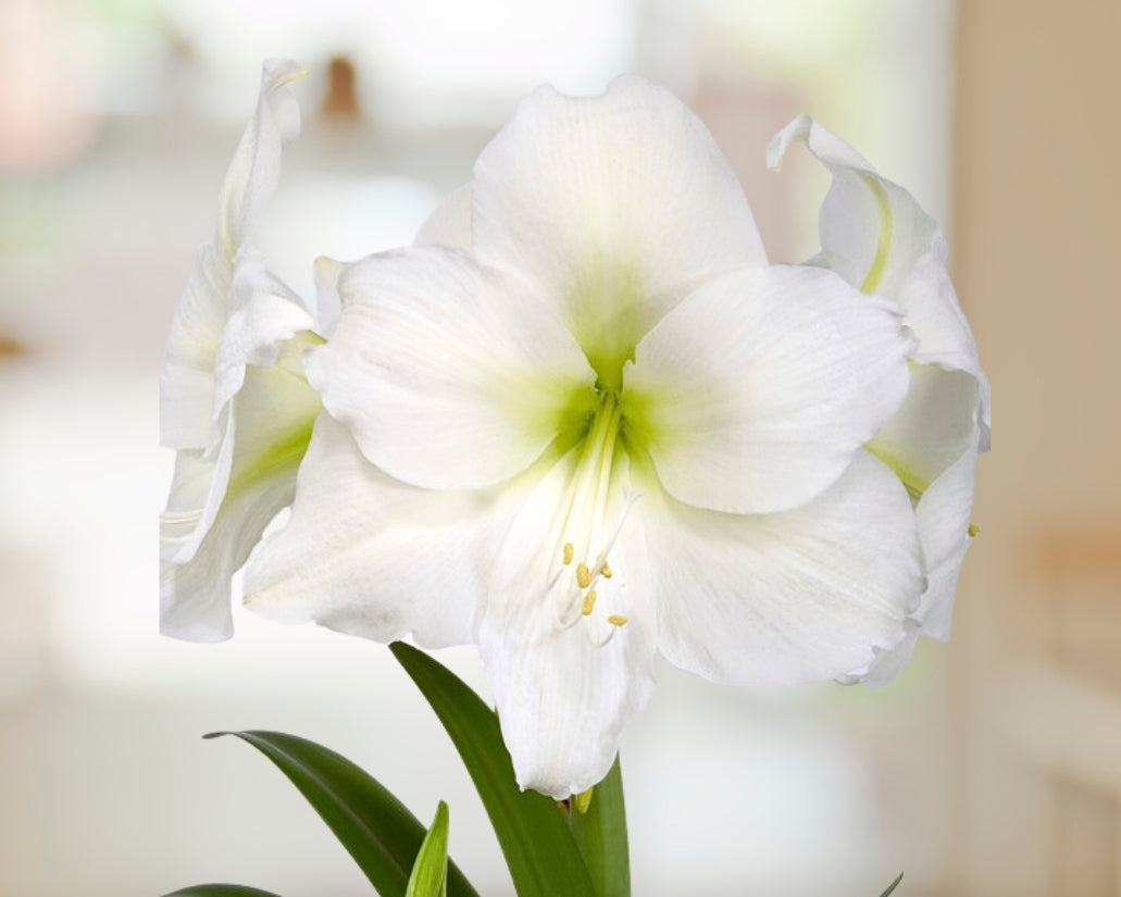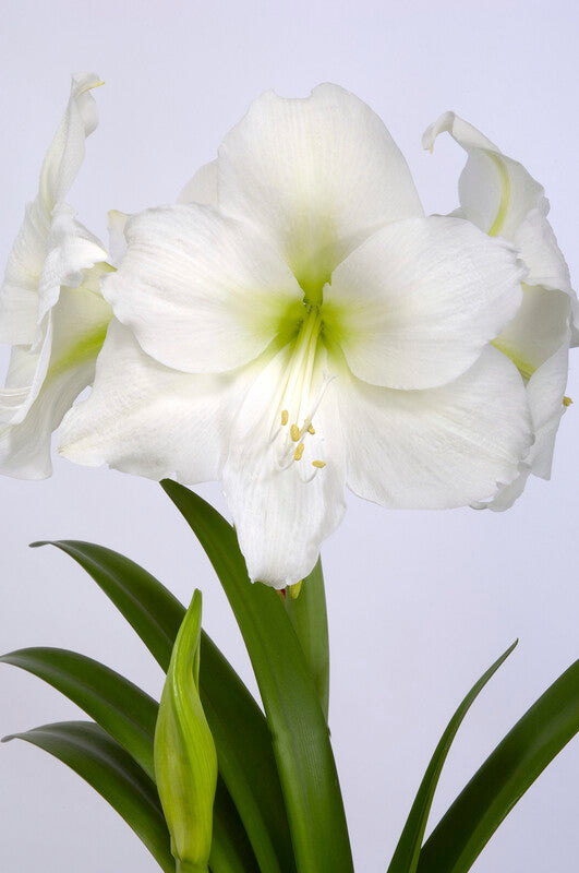 Amaryllis 'Christmas Gift' reaches 14 to 18 inches tall, featuring 7 inch pure white trumpet-shaped blooms with a soft green throat. Each jumbo-sized bulb (36/+) produces two to three thick stalks, with four to five blossoms per stem, blooming 8 to 12 weeks after planting
