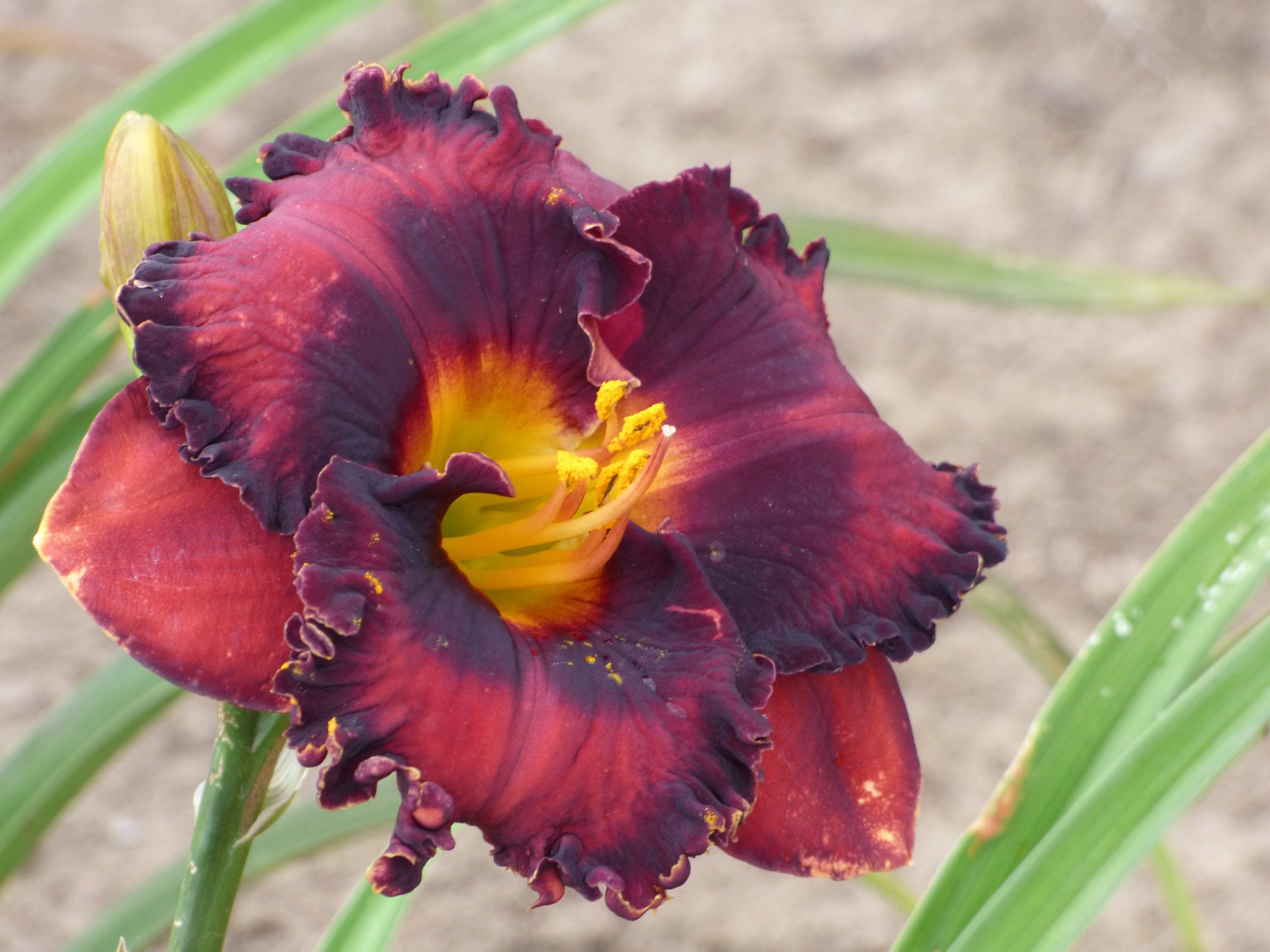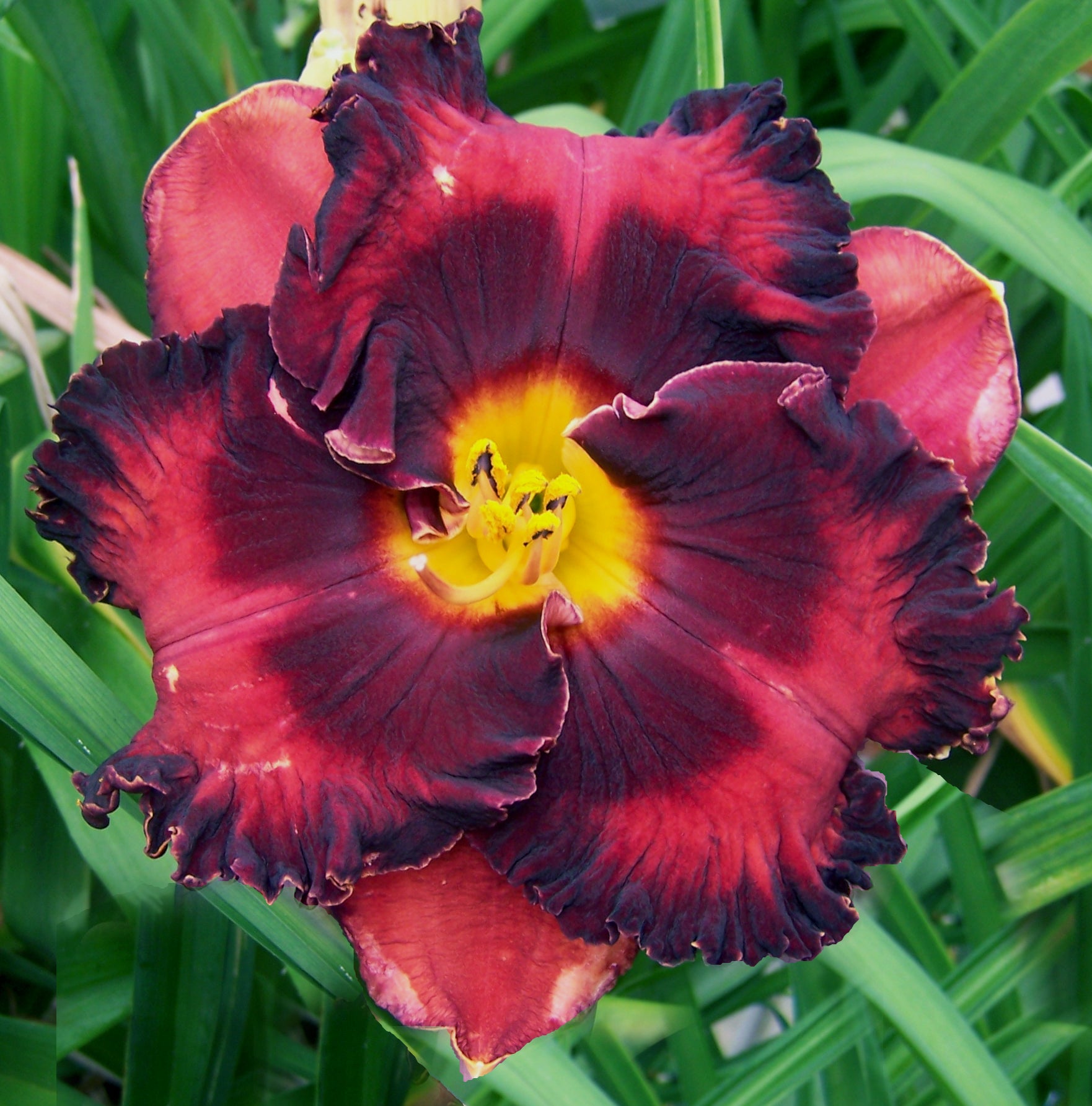 Theodora is a mid-season, semi-evergreen daylily standing 27 inches tall with 5-inch velvety mahogany petals (RHS 46A). It features a gold throat, a diffused very dark eye, and a wire edge (RHS 183A). This fragrance-free variety produces 15 buds and is developed from a complex pedigree including Secret Agent, Triple Delight, and other selections, seedling R1335A. Theodora offers rich color and reliable blooms for garden enthusiasts.