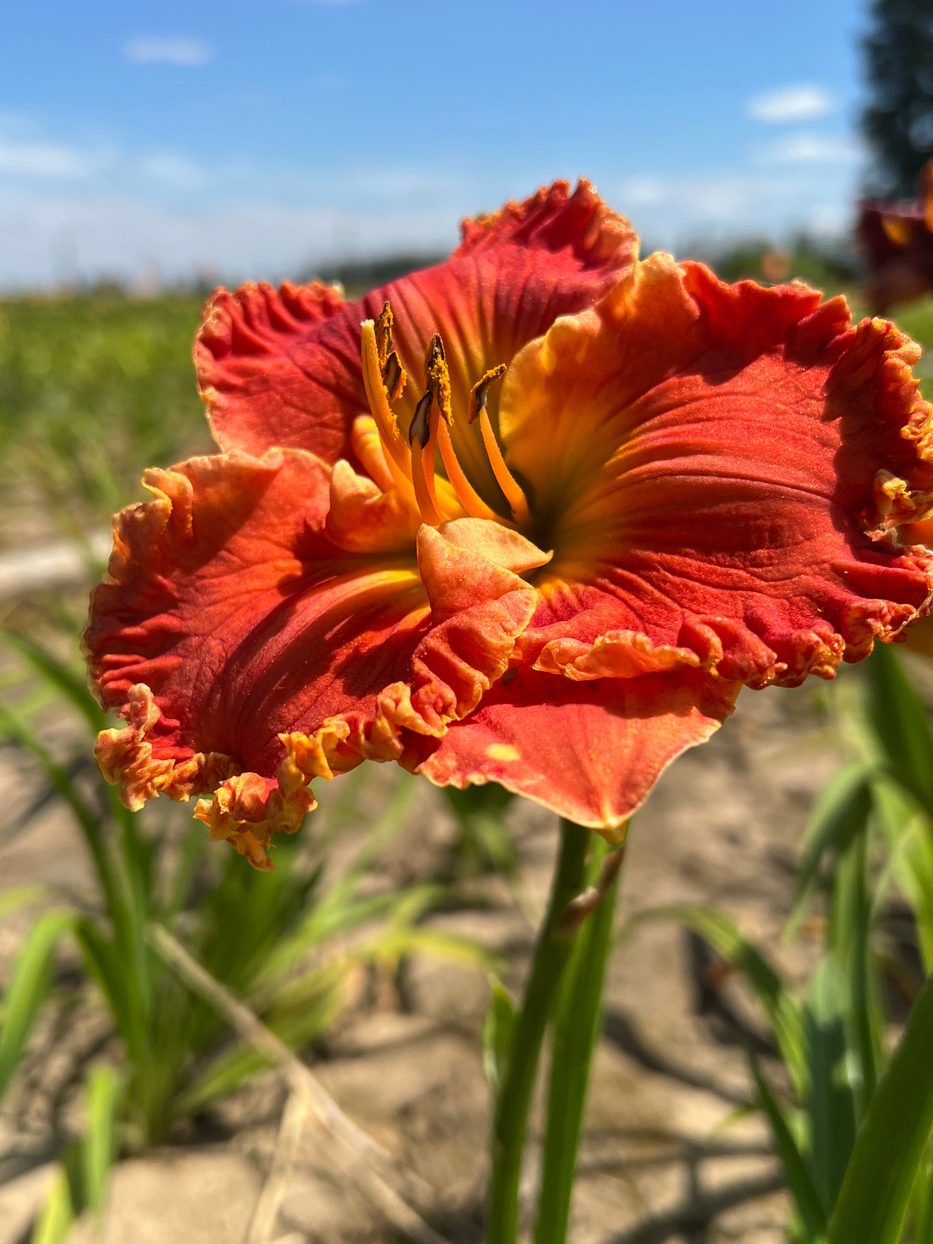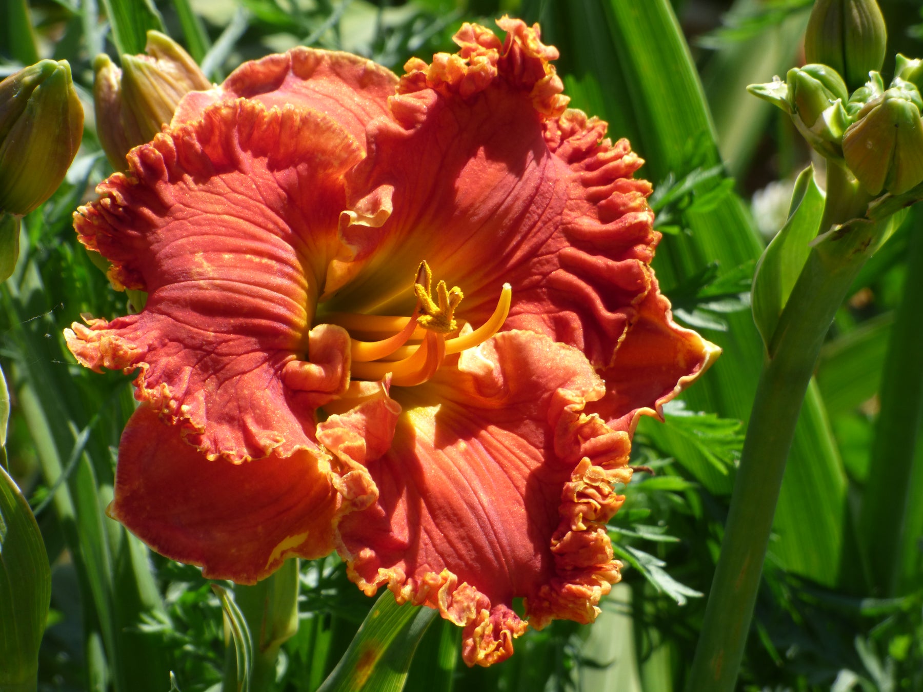 Warm Touch is a daylily featuring orange-red petals (RHS 33A) with a gold throat and ruffled gold edges. Its wide, overlapping petals are heavily ruffled, creating a textured appearance. This variety produces 21 to 25 buds across three branches, with blooms measuring 5.5 inches in diameter. It has a diurnal bloom habit and semi-evergreen foliage. As a tetraploid, Warm Touch is bred from Rodrigo crossed with (Coming Alive x Sdlg), combining vibrant color and strong growth characteristics.