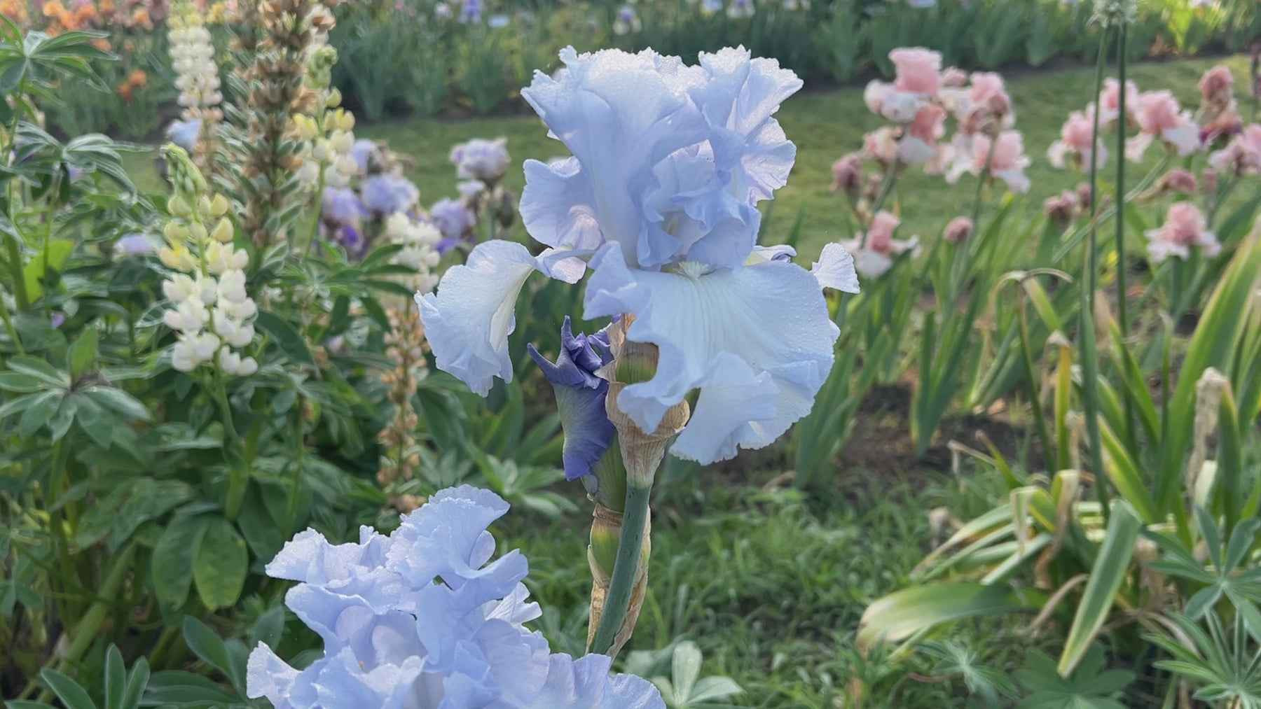 This gem bespeaks Abundance!  There is a fullness, a healthy bursting forth, in this heavily ruffled,  sky blue self.  Standards are sky blue and the falls are slightly lighter in the center. The white beards are tipped gold.