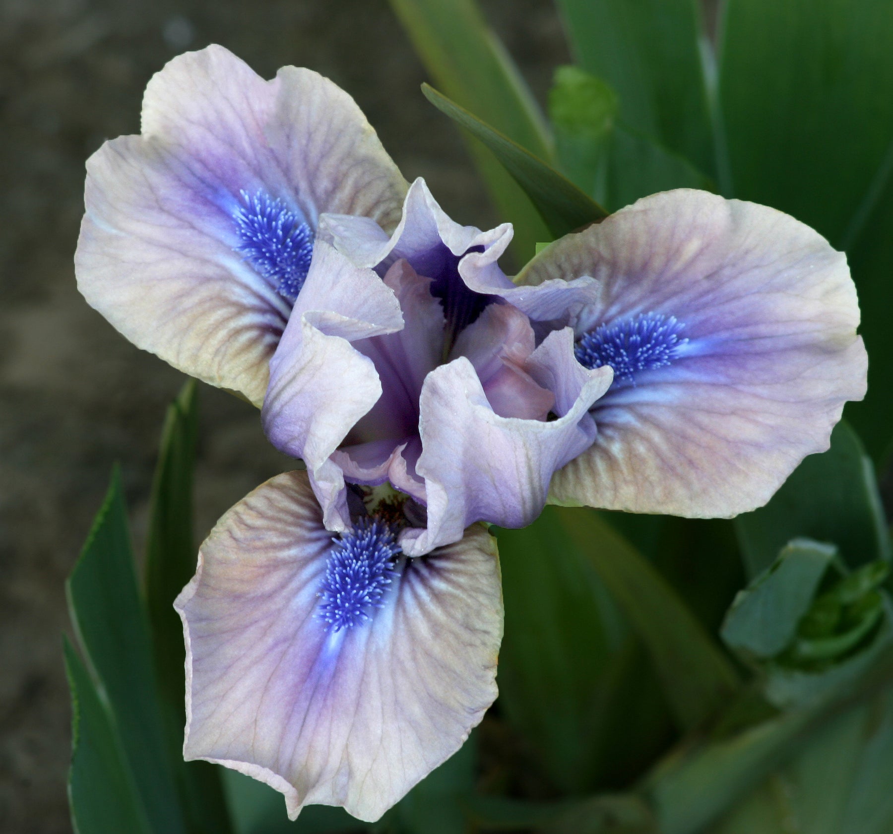 Standard Dwarf Bearded Iris: Dusky pink with tan and white ray pattern under blue beards.