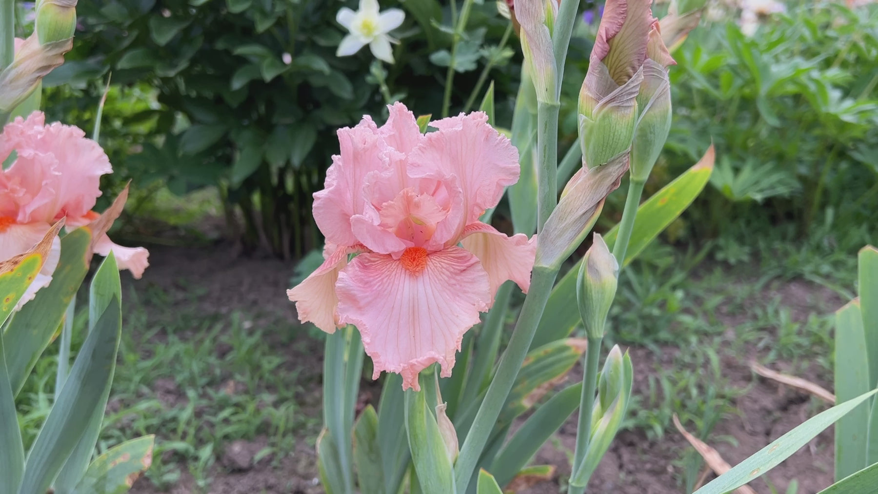 Our photo illustrates how Augustine is carving its own niche. Bold orange beards wonderfully complement orchid pink standards, salmon style arms, and especially the ivory- centered falls. Orange venations add pizzazz to the rose-colored hafts of this laced beauty.