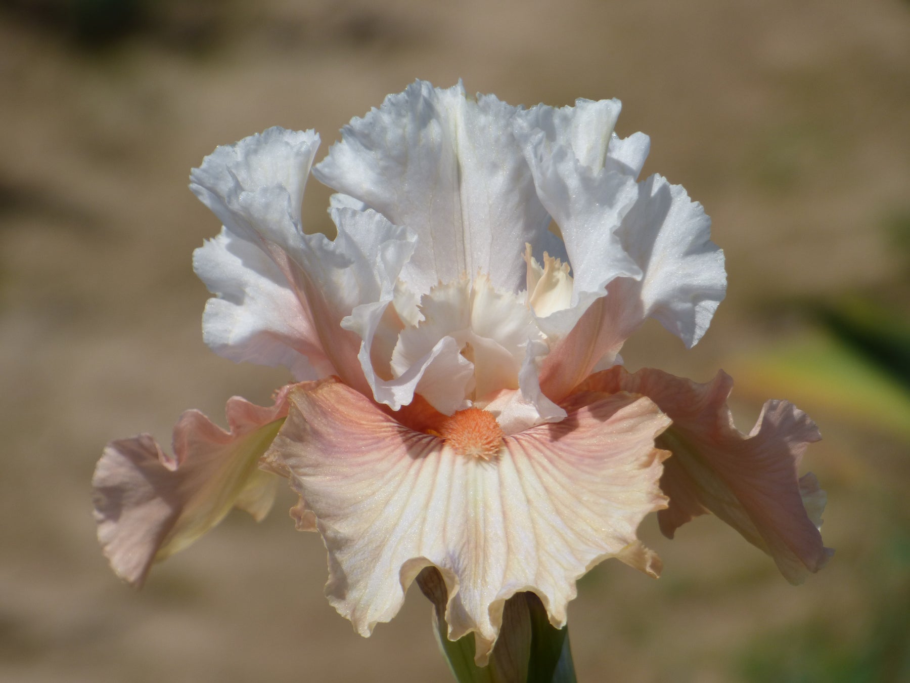 Standards white, mid pink base transitioning to mid pink veins over center; style arms light peach; Falls warm green-cream, mid dusky rose haft and textured veins; beards mid-tangerine; slight sweet fragrance.