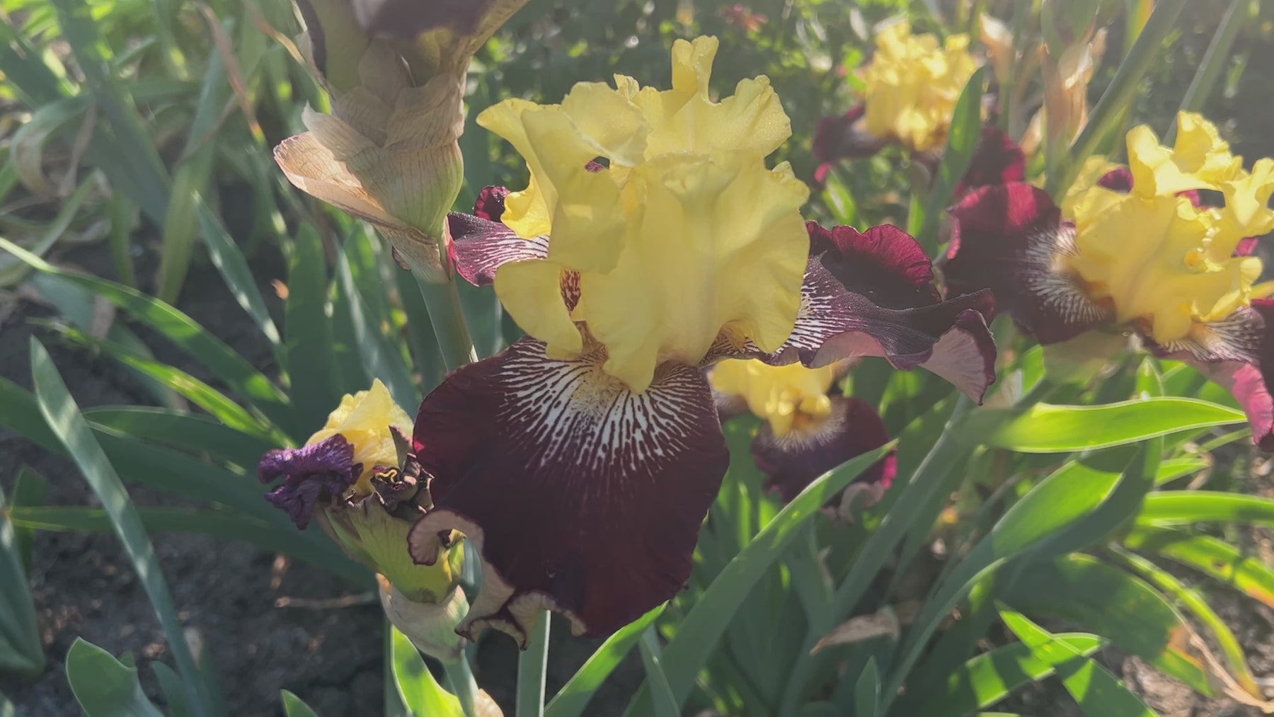 Tall Bearded Iris: When the beehives are active, and the bees are busy coming and going, there is a palpable feeling of excitement. Kind of early in bloom season, Elderberry Mead's buds begin to unfold. Exceptional bloom habits yield eight, nine to ten flowers on each bloom stalk. Suddenly your eyes implore, What's the hurry? Tarry awhile. - Inhale the lovely standards and notice their wire-thin edging. The falls' pristine spray patterns inject a gigawatt of personality. This latest version of the classic variegata creates a commotion in the garden. Beekeeping. Our Tall Bearded Naming Contest winner is Aerie C. My husband is a beekeeper and crafts mead, using our honey, and fruits from our orchard. The standards are honey-colored, and the falls as dark as elderberries.