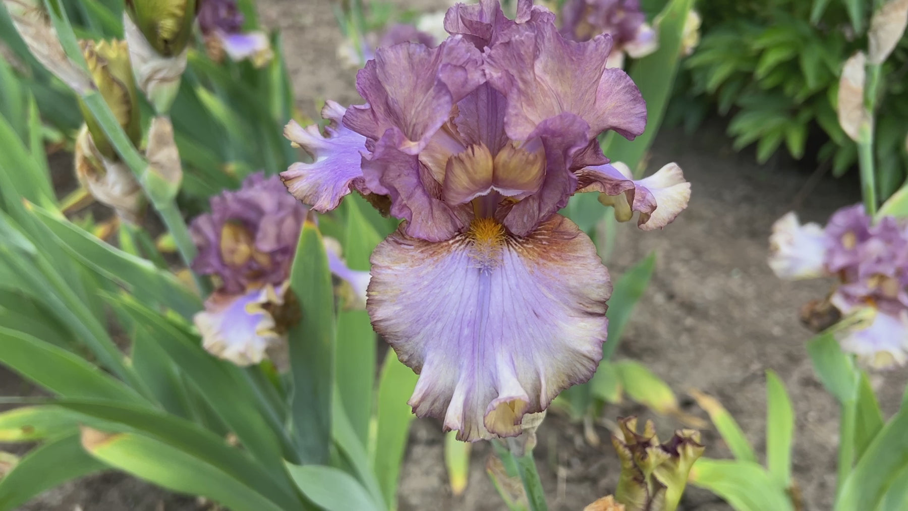 Our photo displays this bicolor's captivating colors. Express Yourself exhibits perfect form. Its gold standards are misted heliotrope, darkening on the perimeter, creating stunning contrasts. By comparison, the falls are rather subdued, albeit attractive. Light purple striations overlaid on the white ground, nicely complement the golden brown haft markings. Stippled edges enhance the exuberant ruffling of the falls. Great Smokey Dawn X Dakota Smoke.